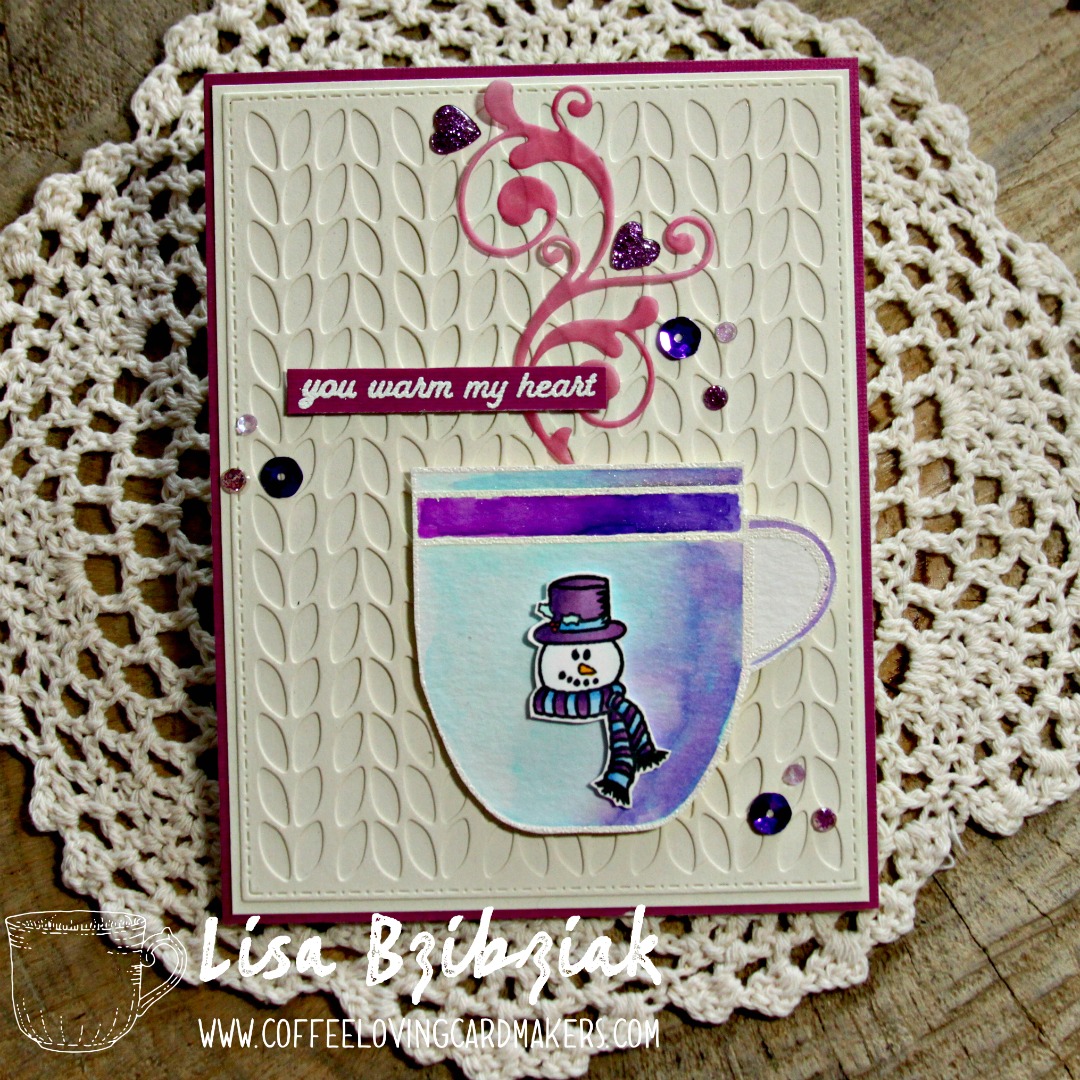 Firstly, THANK YOU so very much! I am so excited to win that adorable Waffle Flower set (my first WF product). And 2nd, your cup, the colors, the snowman, I LOV*E it. Love the way you colored that cup – unique and pretty. And well, I love purple. Gorgeous card, Lisa!