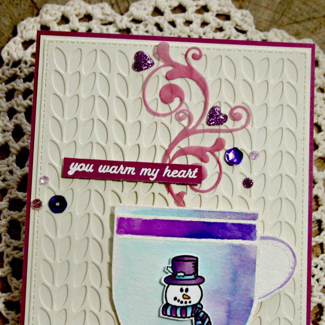 The steam was cut from purple vellum using a die from the Coffee, Tea & Me Die set because it’s awesome and I love it.  Finally, I added one of the many great sentiments from the set and a few sequins!  A frosty but cozy card!