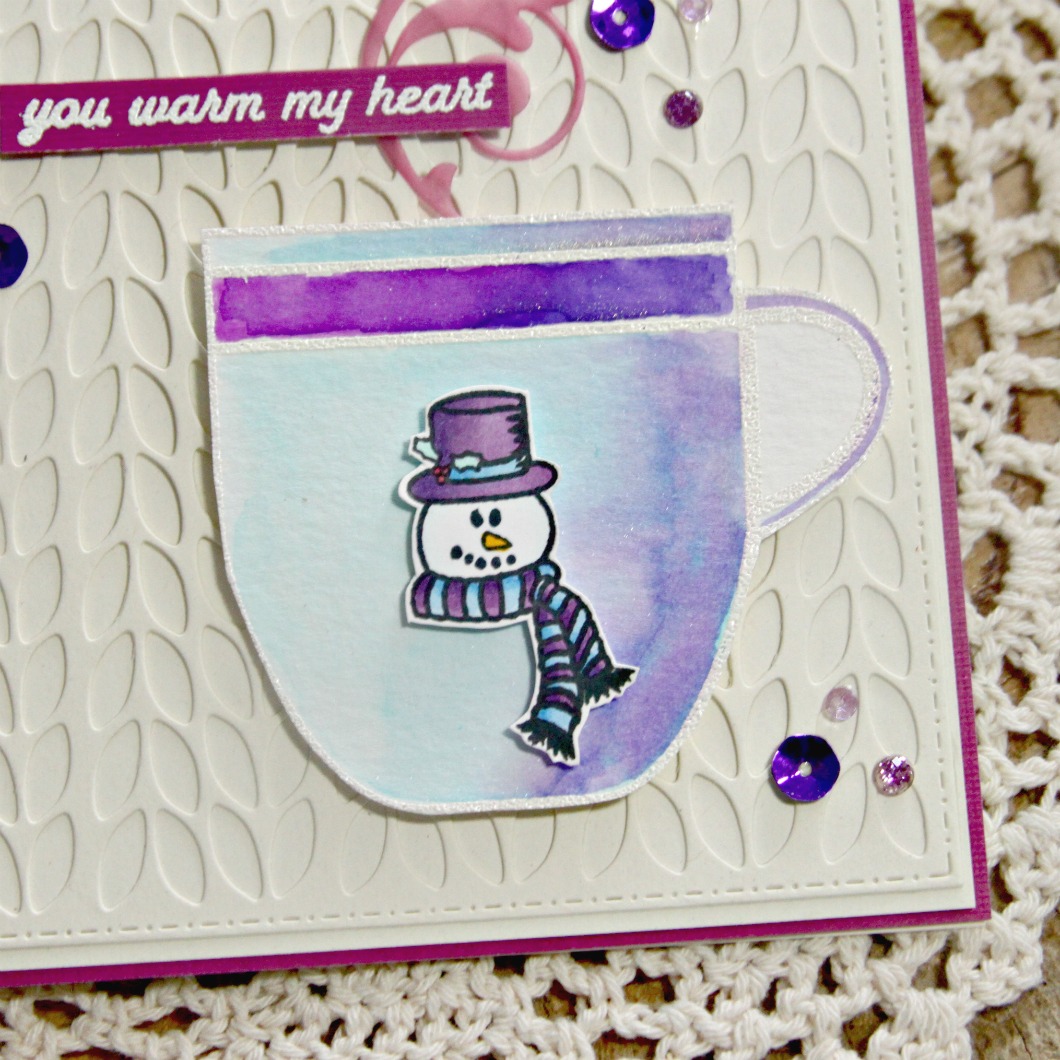 I love that knitted die background, so perfect for this coffee cup with a cute snowman! Lovable! Congrats to Becca!