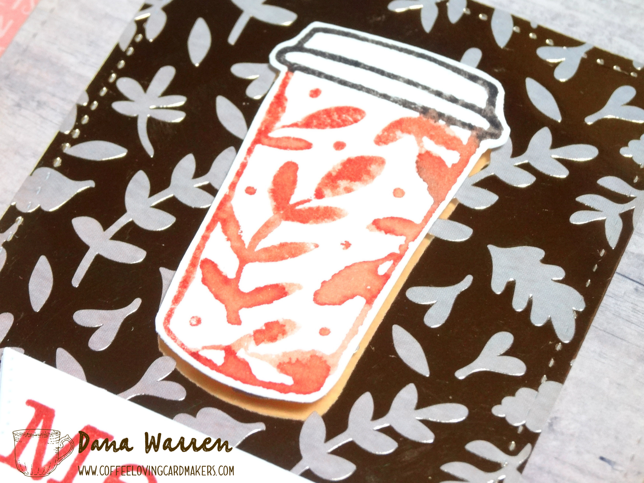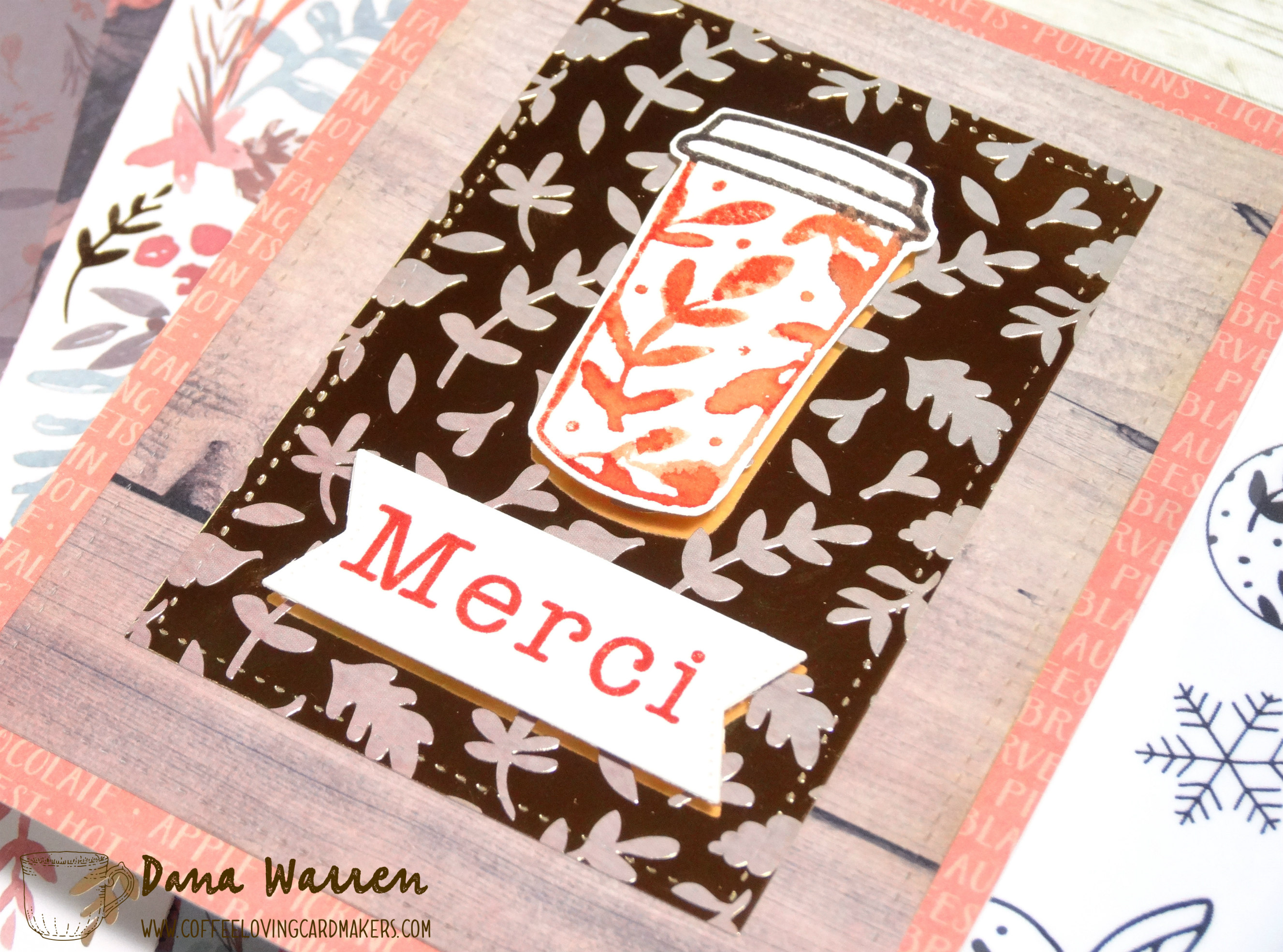Then I picked out a wood pattern paper and a leaf foil pattern, using stitched rectangles to die cut them. I added an orange pattern to a white card base, then added the die cut layers. Last I added the cup and sentiment with foam tape.