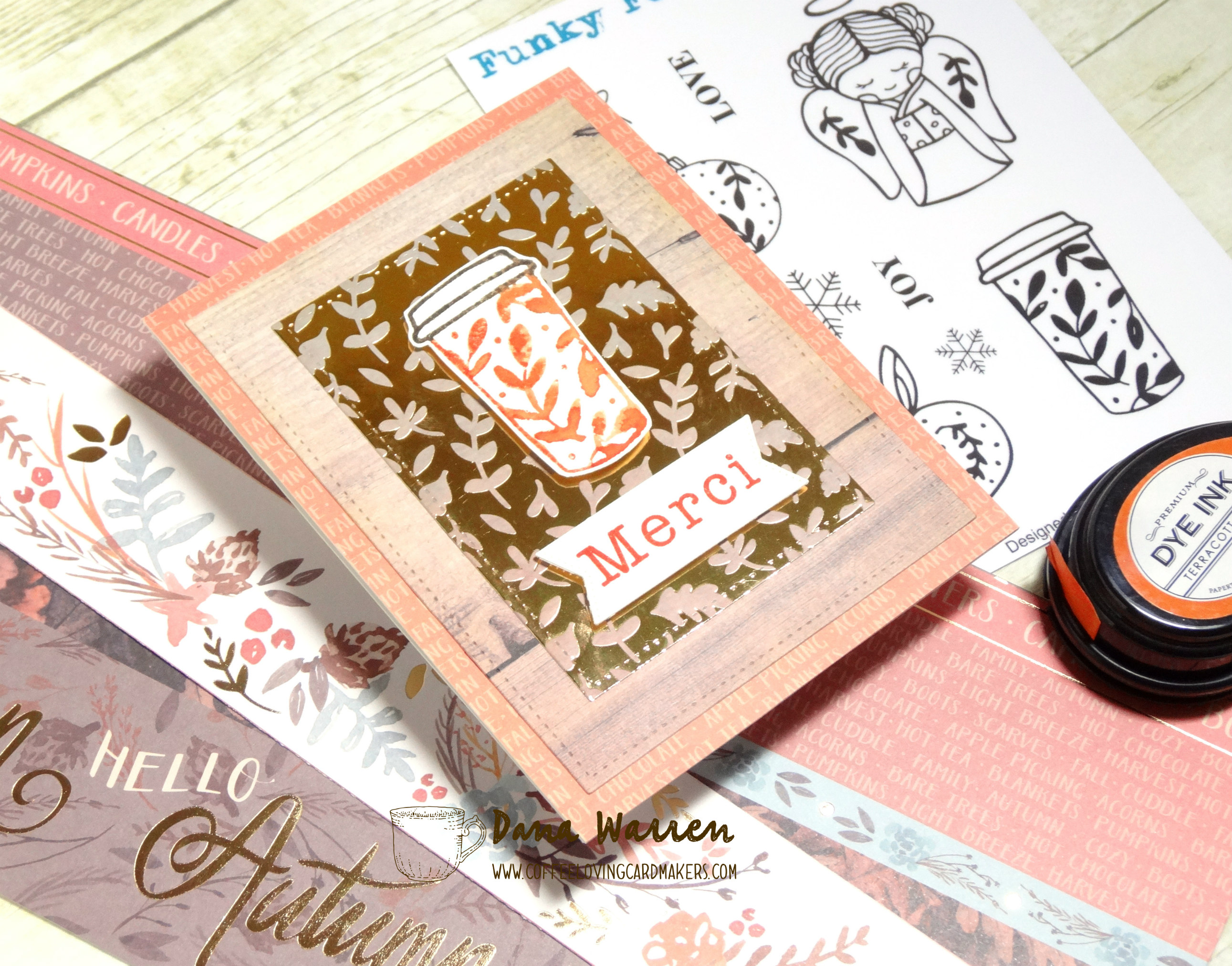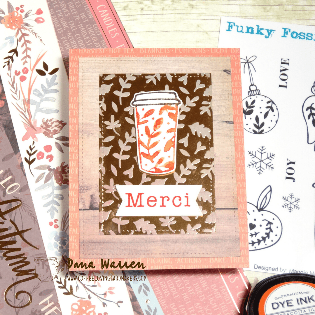This challenge came around at the perfect time, what better day for a Thank You card!!! I decided to use a Funky Fossil Designs, Folksy Christmas stamp set. The set has a cute coffee cup, the leaf like design, I thought, would work for fall too!