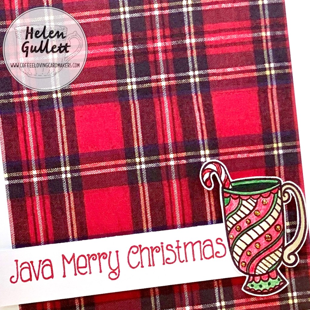 The plaid patterned paper on the background is from my stash. I got this plaid paper pad from Hobby Lobby. I trimmed it into bit smaller than the card base. I added it on the card with Scrapbook Adhesive E-Z Grand Runner by 3L and then I added both sentiment and the Christmas mug on the card with 3D foam tape.