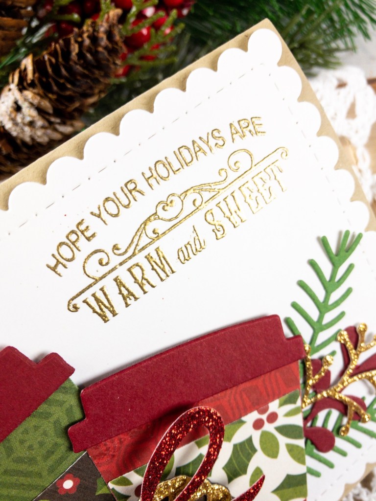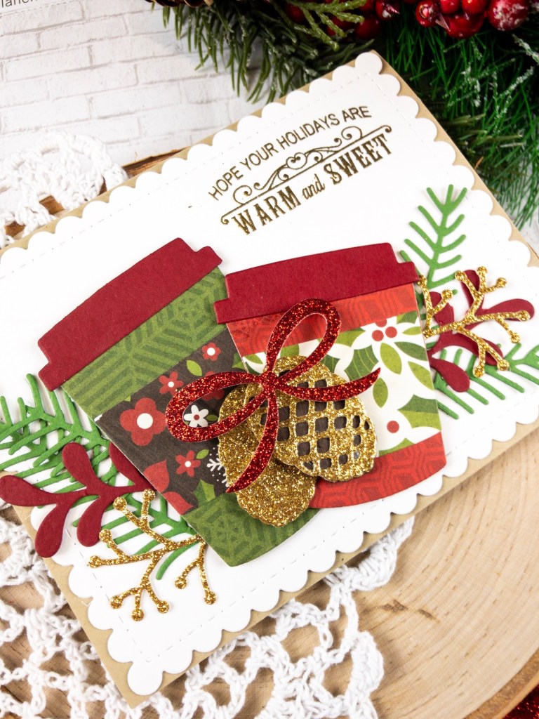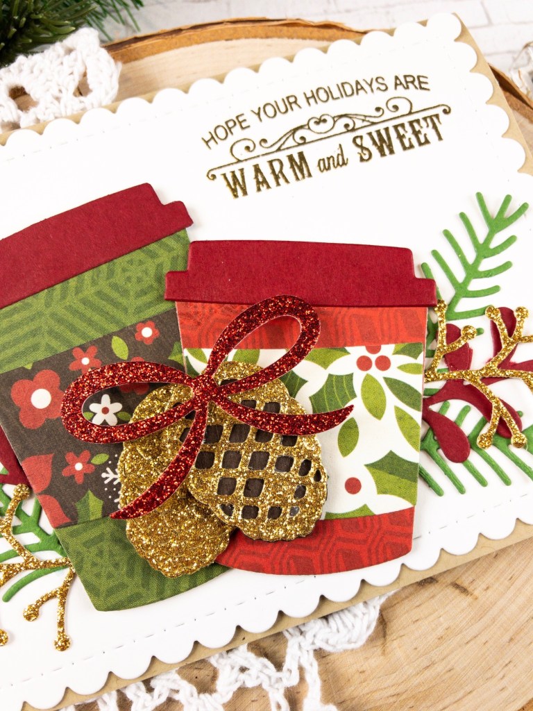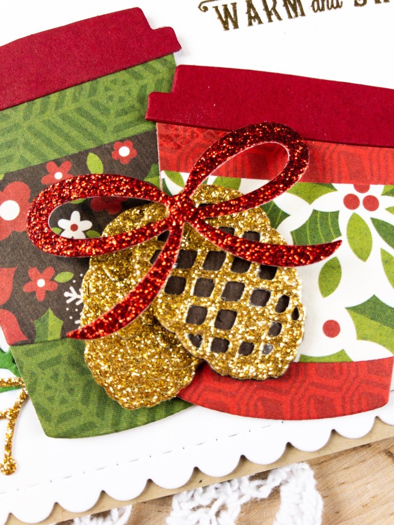 Lastly I added two pine cones cut from gold foil paper and a red bow die cut from red sparkle paper to the center of the coffee mugs for lots of added glitz and sparkle!