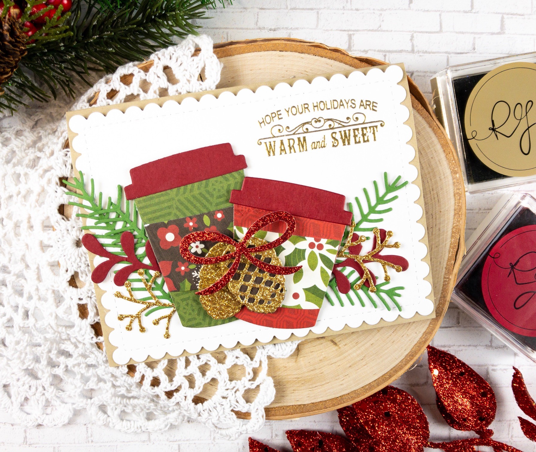 I die cut the coffee mugs, cozies and lids using the Hero Arts Coffee Cup Tags Frame Cuts.  The lids were cut from solid cherry cardstock and the coffee cups and cozies were cut from the Echo Park Here Comes Santa Claus paper pack. I adhered the two coffee mugs to the card using foam adhesive for added height and dimension.