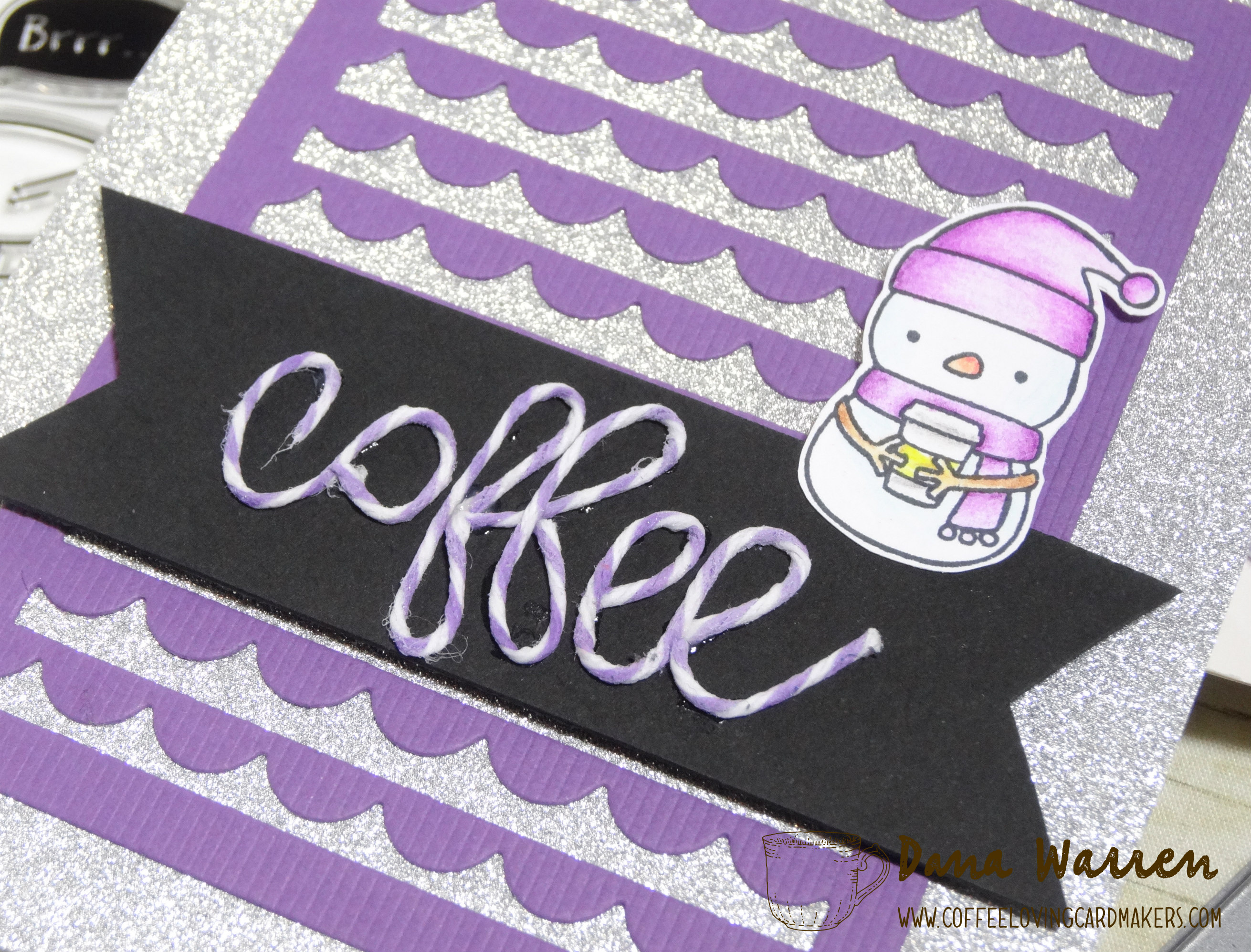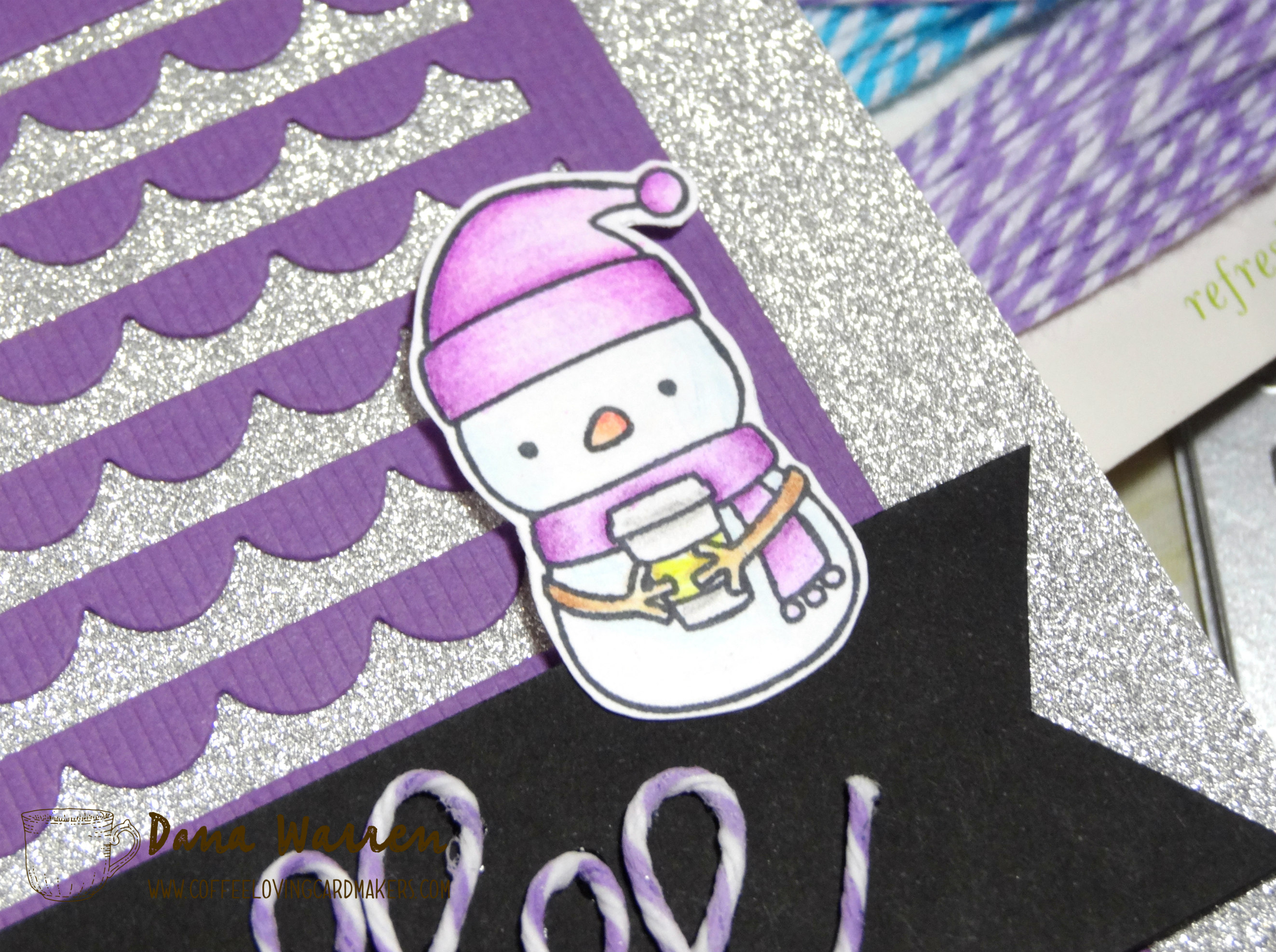 When the twine word was dry I adhered it to a strip of black card stock. Then I notched the ends. I added the purple panel to the card and then added the black strip and snowman with foam tape.