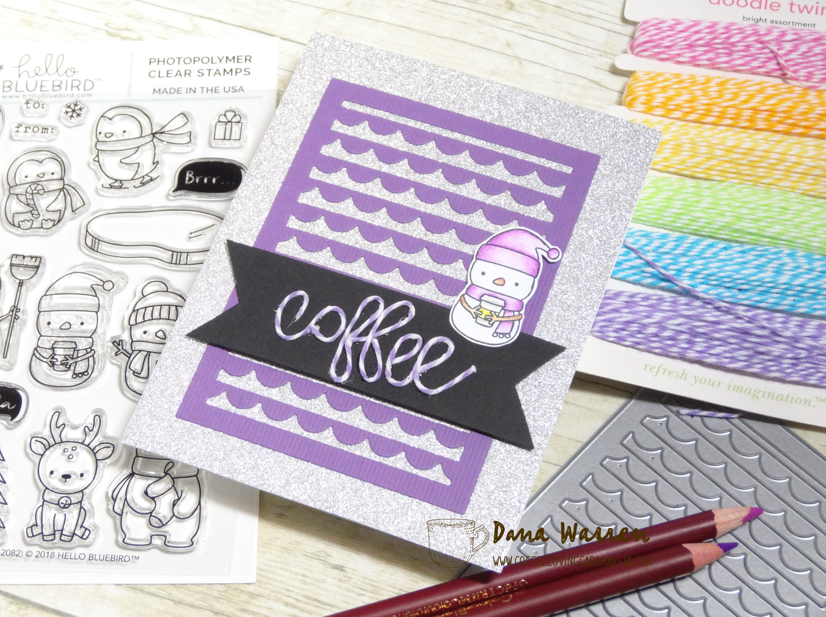 While the twine was drying I stamped the cute snowman with a coffee cup from Hello Bluebird Stamps Frosty Friends set. I used my Spectrum Noir Colorblend Pencils to color the image and then fussy cut it out.