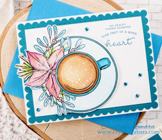 The base of this A2 sized card is made from kraft cardstock. Using the Scalloped Stitched Nesting dies from Gina Marie Designs, I cut the first layer from Neenah Solar White Smooth cardstock. I printed out the coffee mug from the Fresh Start digital stamp set on Neenah Solar White Smooth cardstock and colored it with my Copic markers (colors seen below). I fussy cut the image and adhered the mug to the card using foam adhesive. I placed some linen thread around the mug before adhering the white scalloped layer to the kraft card base. The sentiment is from the “Words to Live By: Kindness” stamp set from Papertrey Ink. I stamped the sentiment in indigo ink in the upper right corner. I added a layer of Clear Wink of Stella to the flowers and mug for added sparkle. Lastly, I added a few turquoise rhinestones around the card for more dimension.