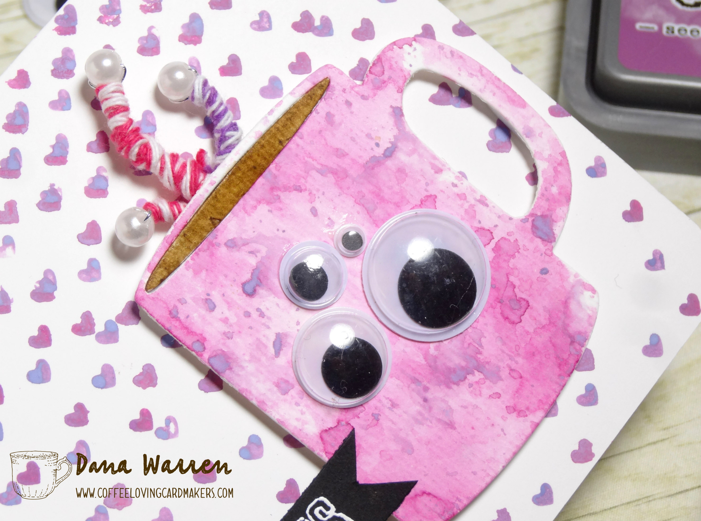From my stash I found these wire flourishes with pearl like beads at the tips. I wrapped two different bakers twine around each branch and then adhered the twine. I trimmed it down and was able to add it to the back of the coffee mug! And wa-la my coffee mug monster!!