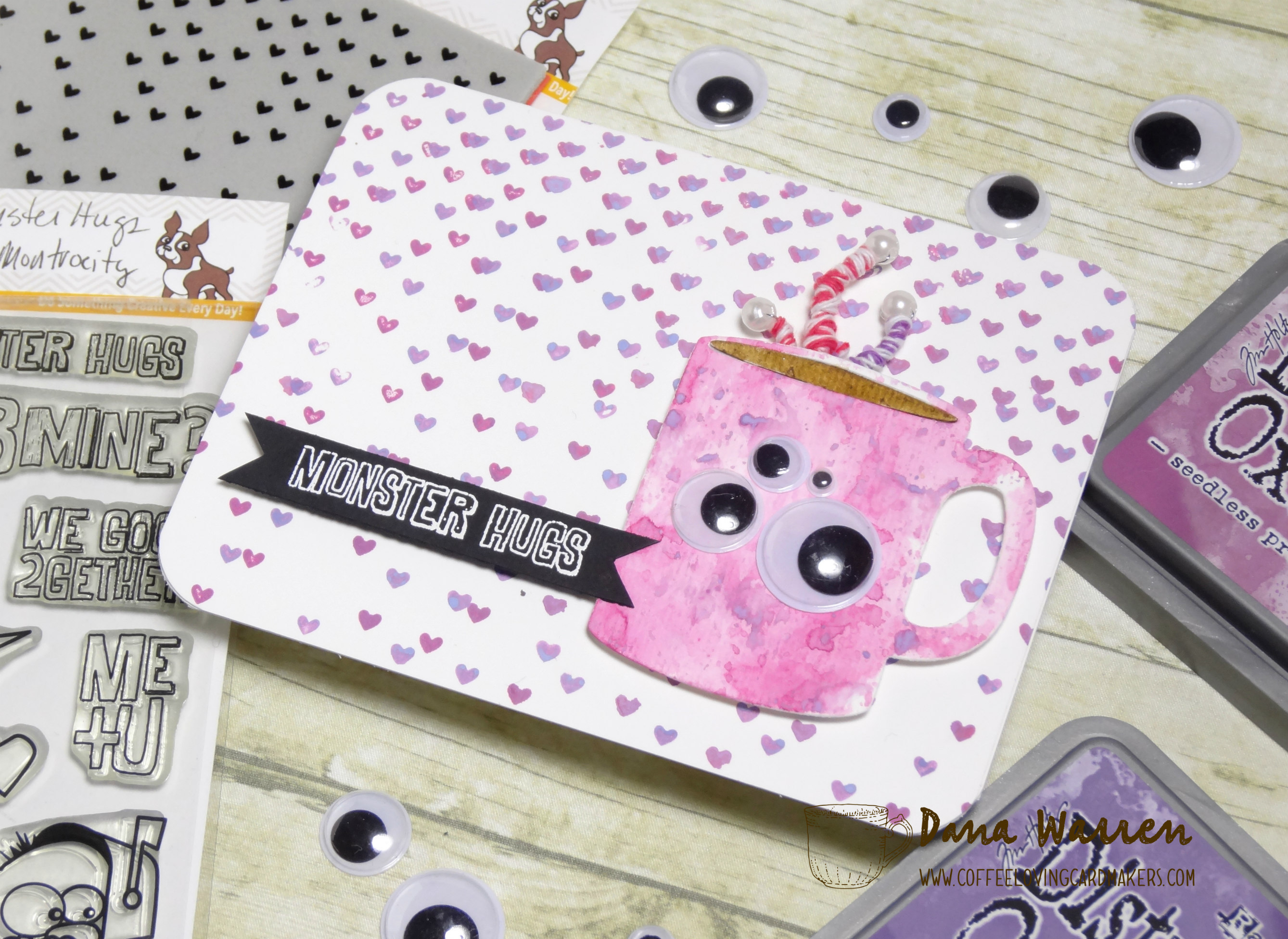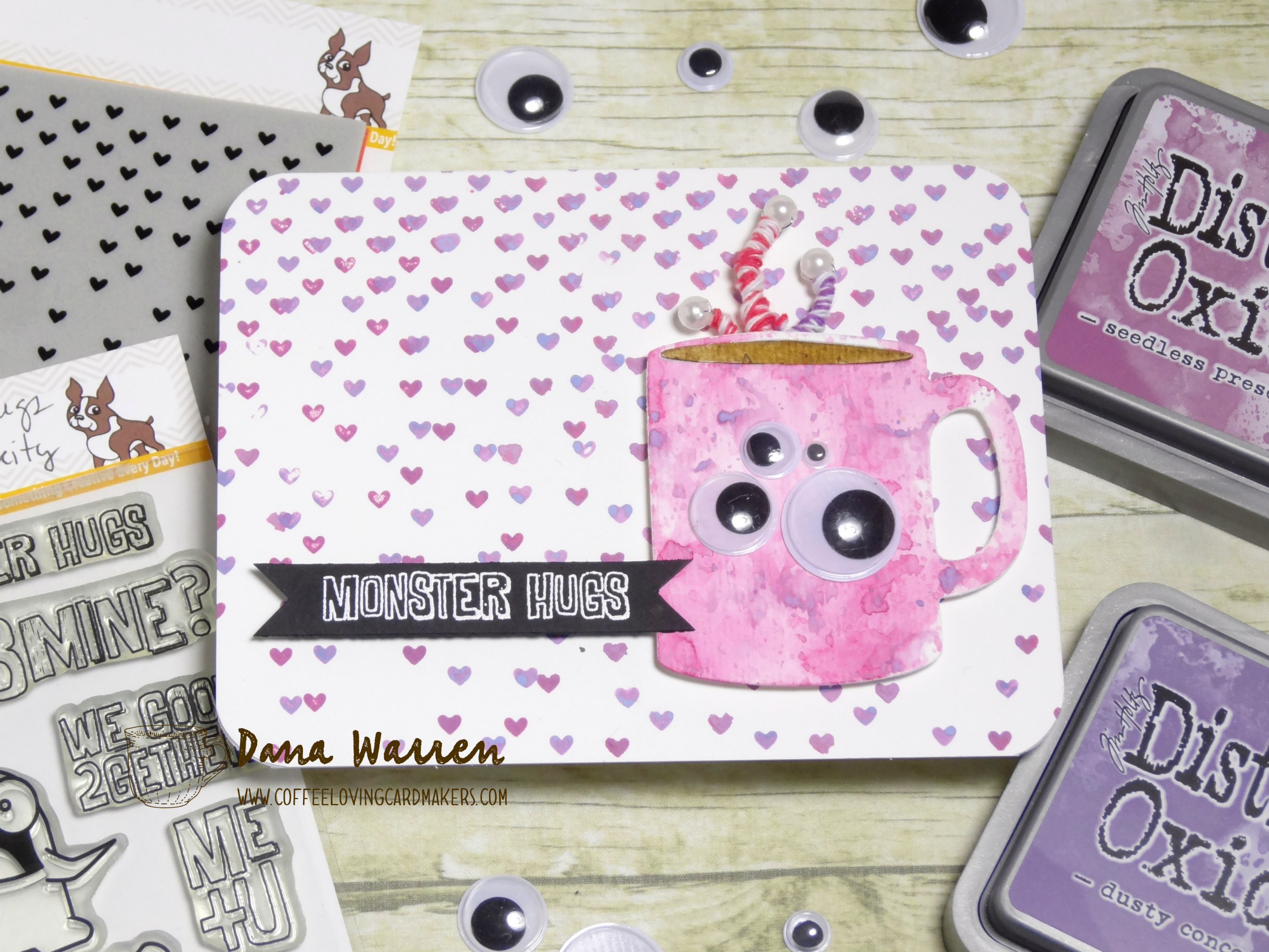 For a background I used an older Simon Says Stamp tiny heart background. Using the same Distress Oxide inks, spritzing them with some water and then stamping it. Then I used Simon Says Stamp Monster Hugs stamp set, with the Monster Hugs sentiment.