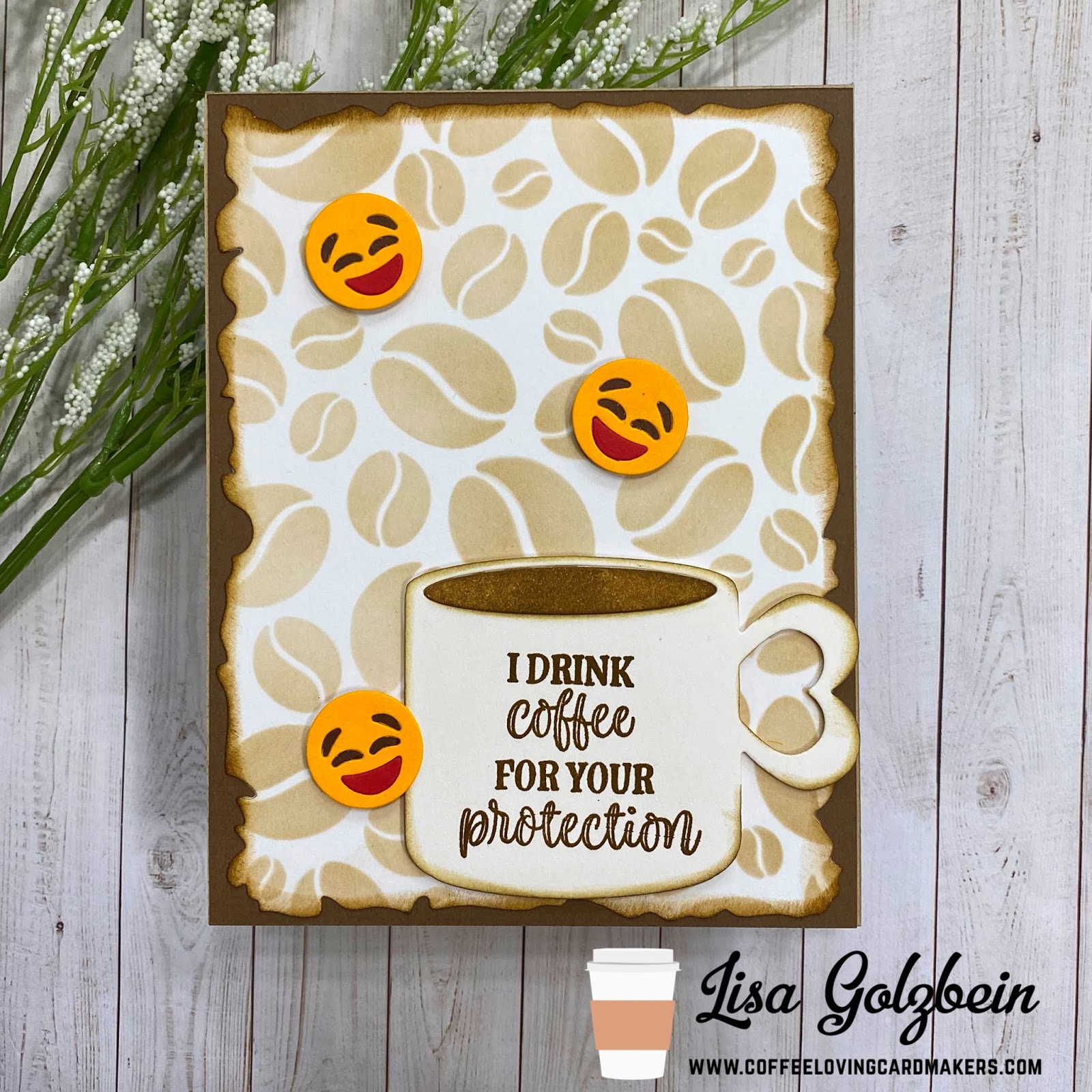 I die cut a piece of white cardstock using the largest die from the Kat Scrappiness Distressed Edge Rectangle Nesting Dies and then sponged some light brown ink over a Gina Marie Coffee Bean Stencil. The sentiment on that adorable coffee cup is from CAS-ual Fridays Hot Coffee stamp set and the cup is cut from their Coffee Cup Fri-Dies. I also thought it would be fun to add some laughing emojis to the card so I broke out an older set of Spellbinder dies that I had and created a few fun faces!