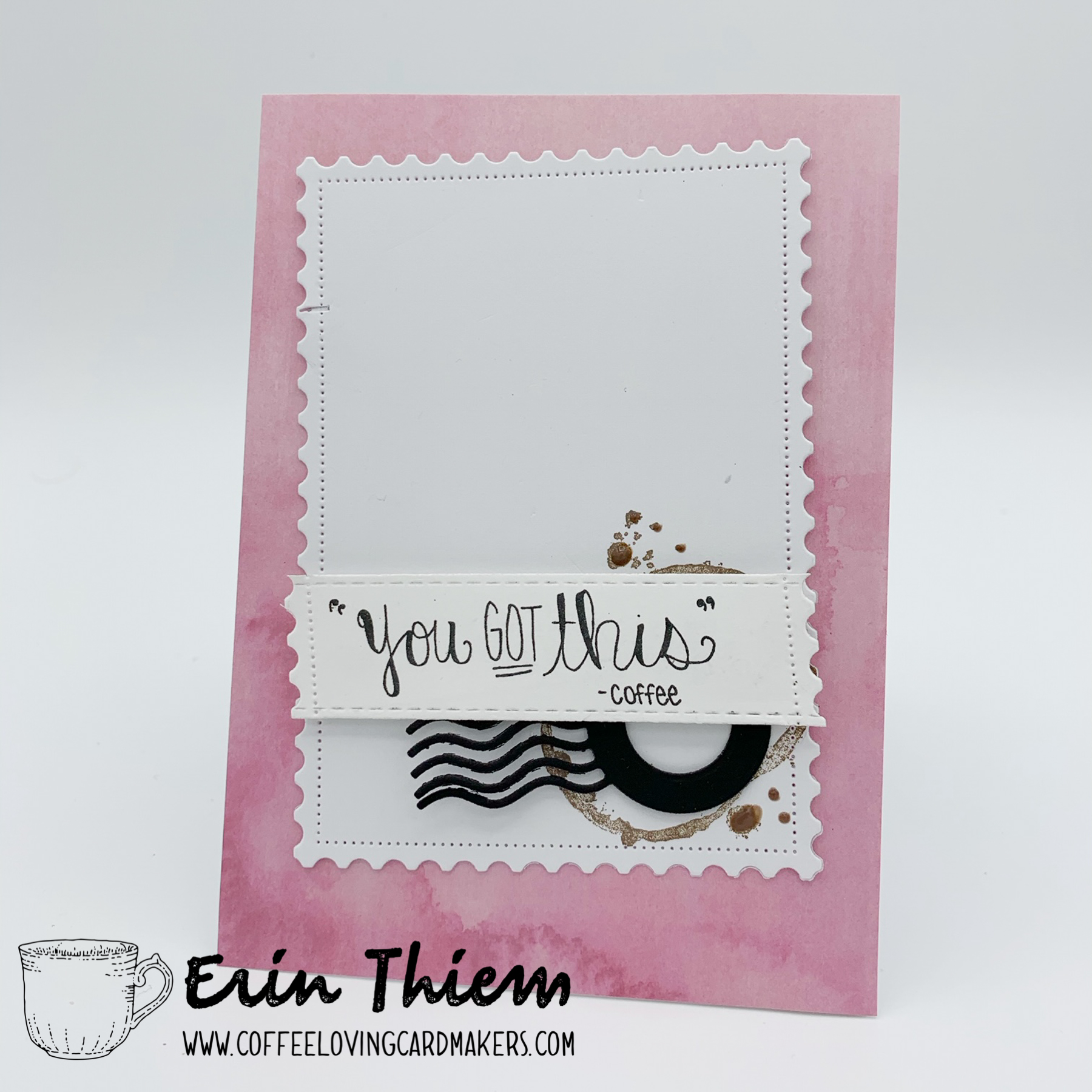 Hello, Erin here with a CAS card… trying to get into the spirit of the upcoming Valentine’s Day holiday with a pink base.  I paired The Greetery postal dies with Joy Clair sentiment.  Hope the pop of color and coffee sentiment card help inspire your next crafty fun!
