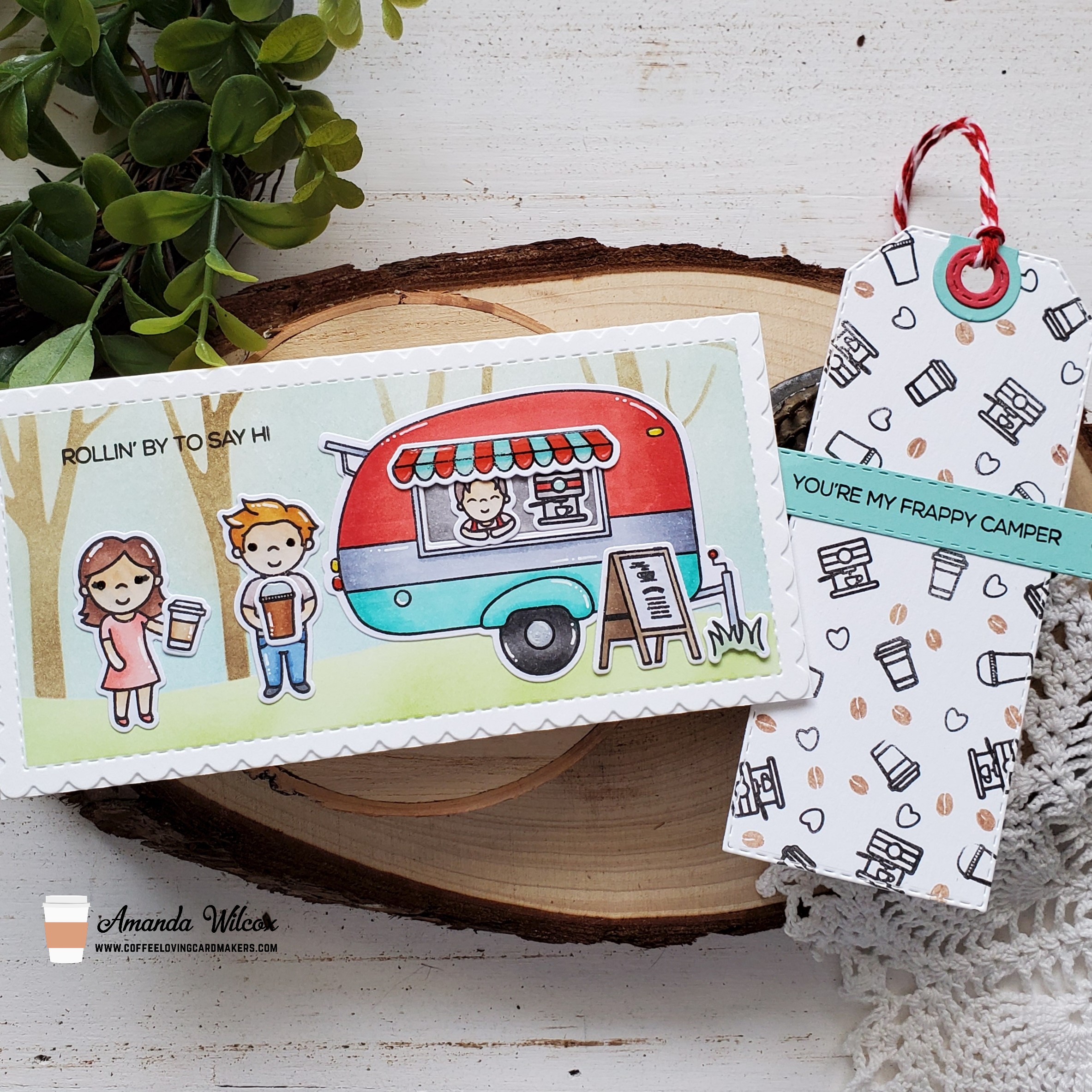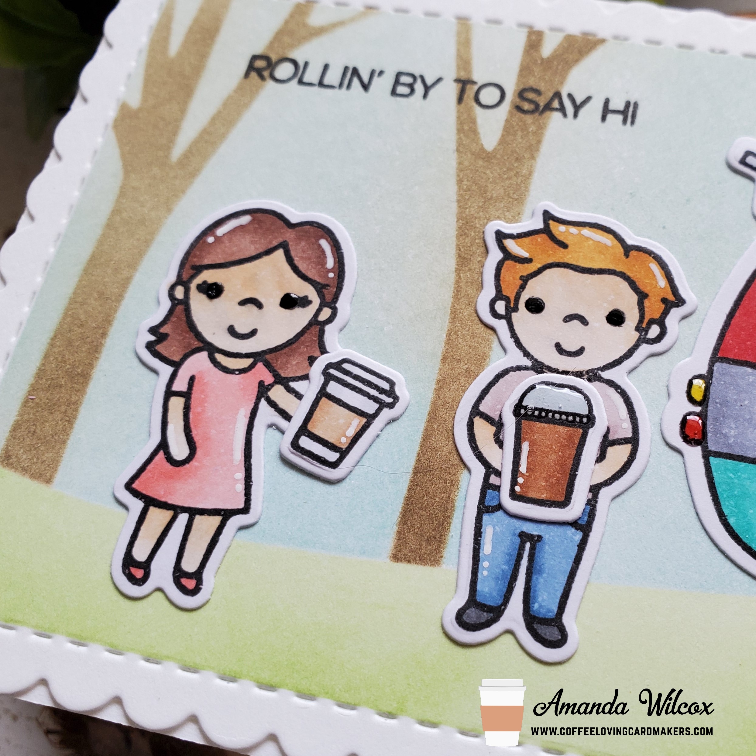 For finishing touches on this card, I added white gel pen accents throughout and then a couple of touches of glossy accents on things like the awning to the trailer and the lid to the guy’s frapp!