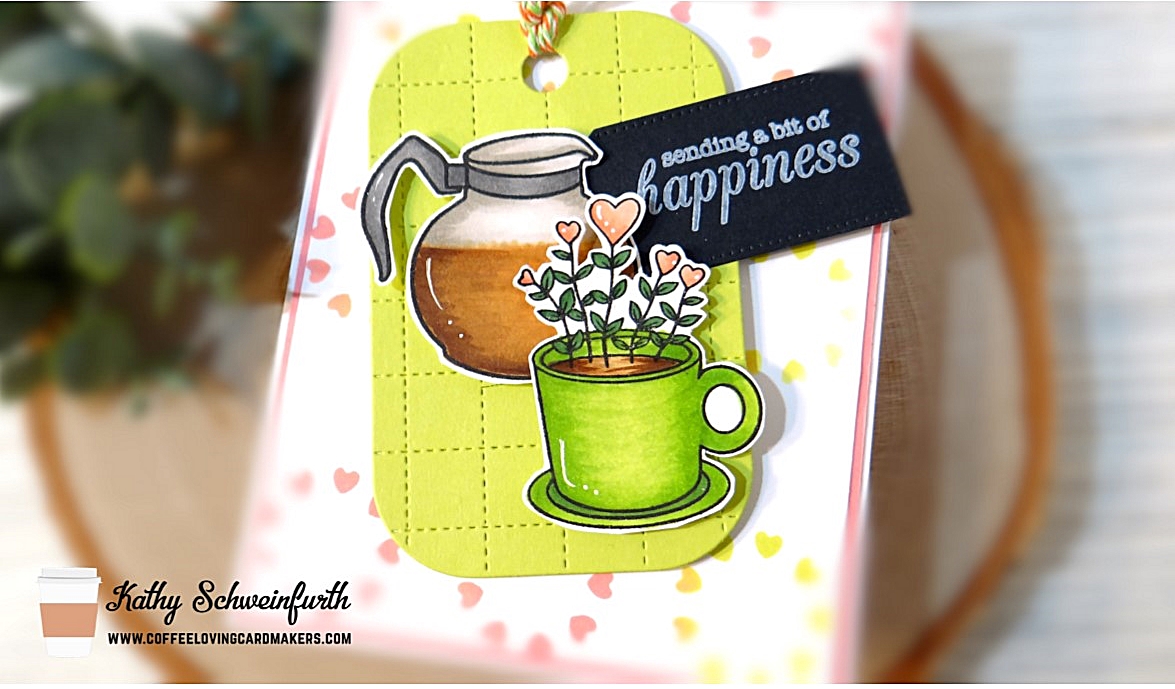 For my card, I used the Reverse Confetti Heart Circle Cover as a stencil and blended Worn Lipstick and Twisted Citron distress oxide inks to create the background.  I then cut lime green cardstock using Reverse Confetti’s Grid Stitched Tag die as a backdrop for these super fun images from Hero Arts Cup of Love stamp set!