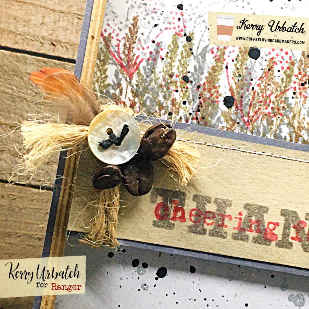 After stamping the background, I added some flicks of black acrylic paint and silver metallic paint onto the panel to help tie everything together. I then grabbed some kraft cardstock and created a sentiment panel. I stenciled the “Thanks” from the stamp/die/stencil set using the Watering Can ink and then added the “cheering for you” sentiment over that using Carnation Red ink. I mounted this panel onto a dark gray piece of cardstock and then machine stitched the top before wrapping it with some jute. To finish things off, I attached a shell button a feather and a trio of coffee beans. I mounted this panel onto a corrugated kraft panel before mounting the whole thing onto a dark gray card base.