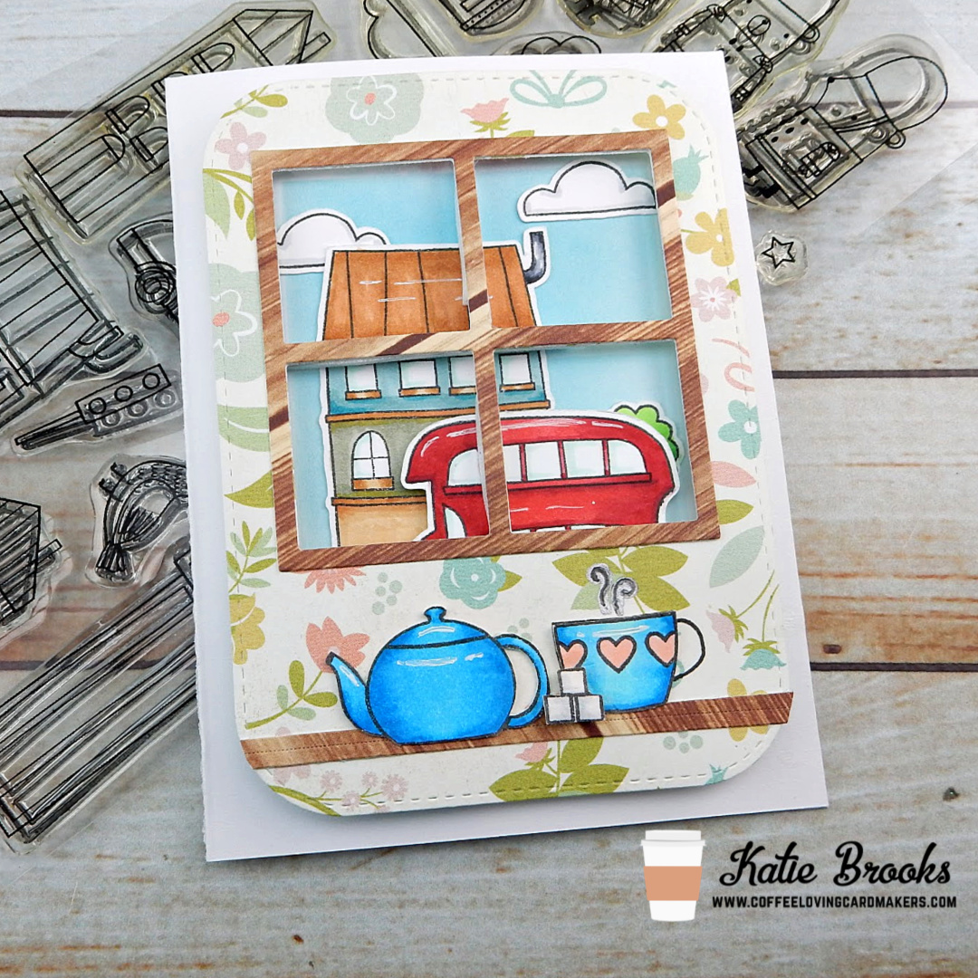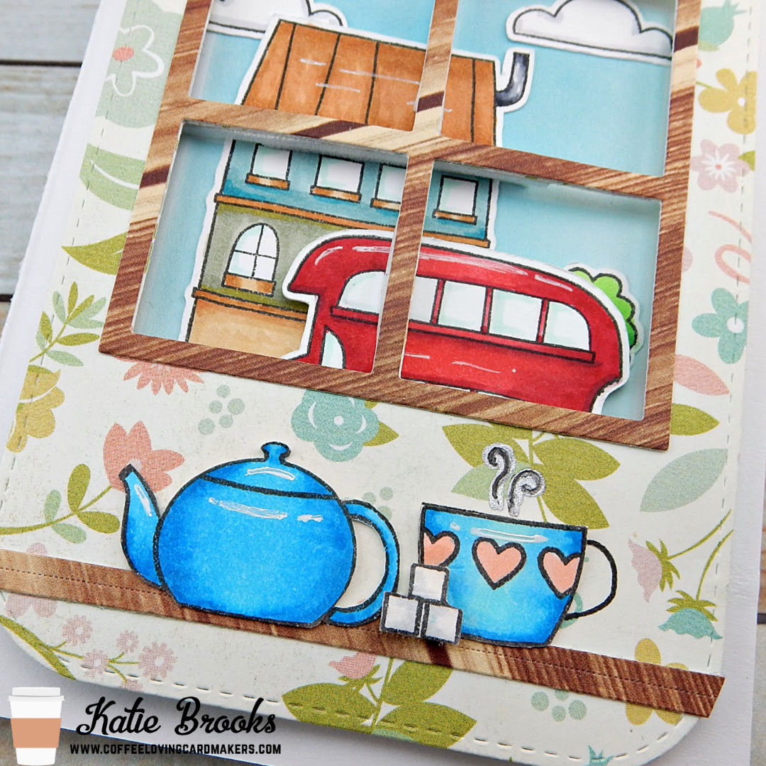 Most of the items are from MFT, stamped, colored and die cut. The window and outside and MFT as well. The floral print is meant to be wallpaper. The mug and teapot are from Memory Box. Everything is colored using Copics. It is a bit hard to see, but there is sparkle on the sugar cubes. I added highlights with my gel pen.