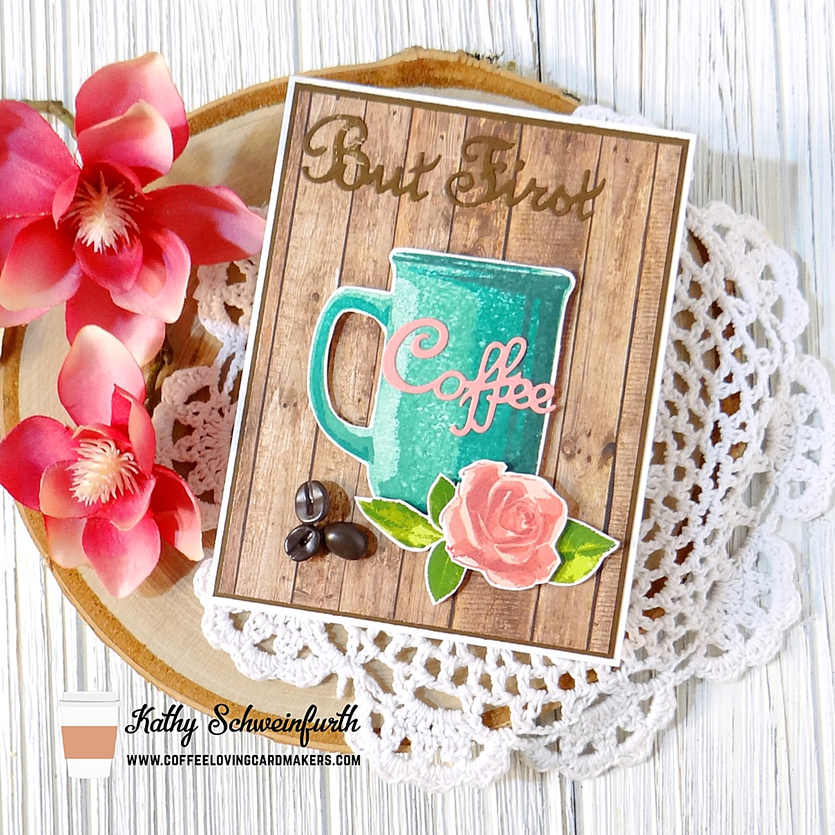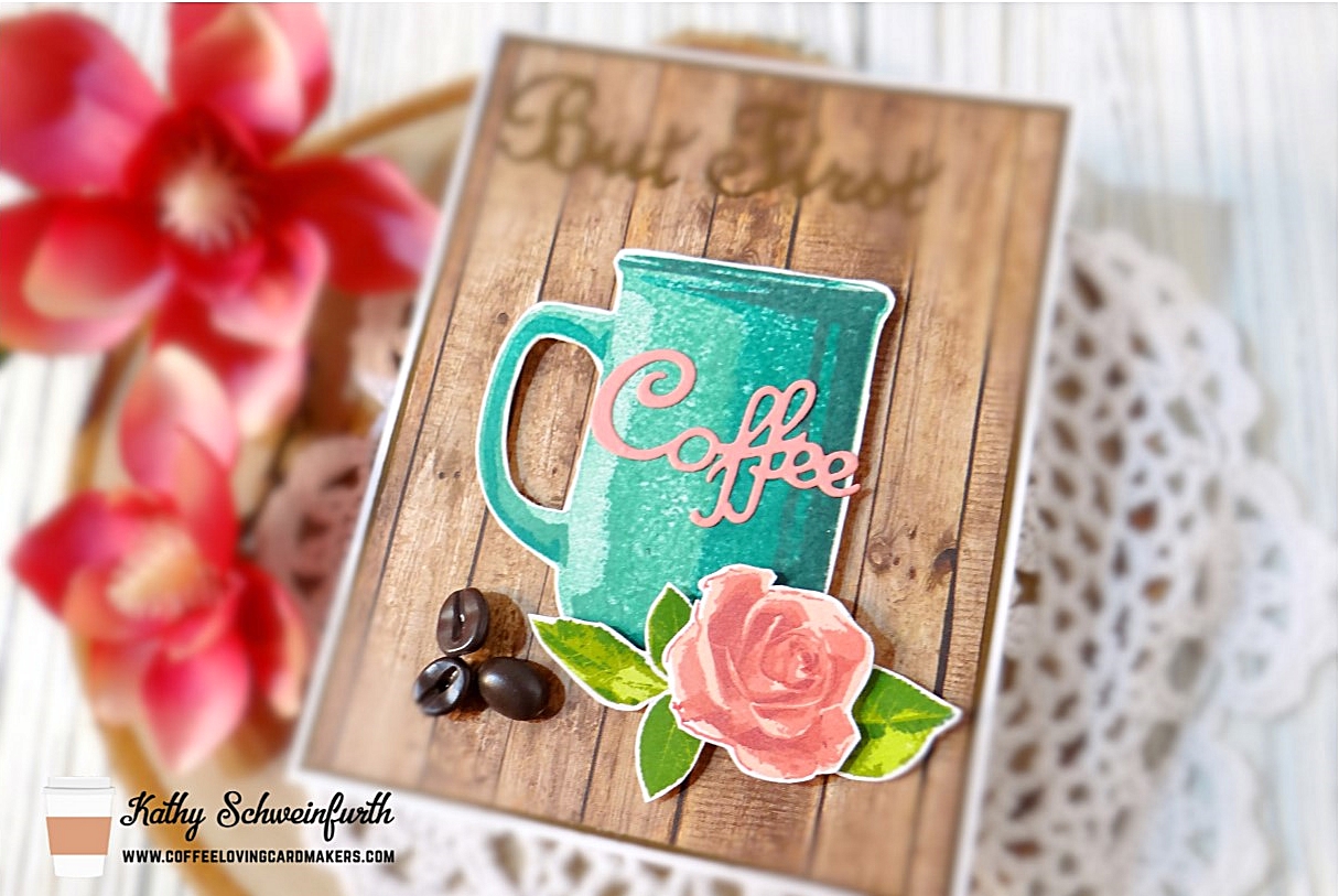 I layered brown cardstock and a wood plank pattern paper to the card base.  The coffee cup and rose are from The Kitchen Sink. I love the realistic results with these multi-layered stamps!  The word die cuts were made with a Spellbinders die and to finish, I added the coffee bean embellishments from Kat Scrappiness.