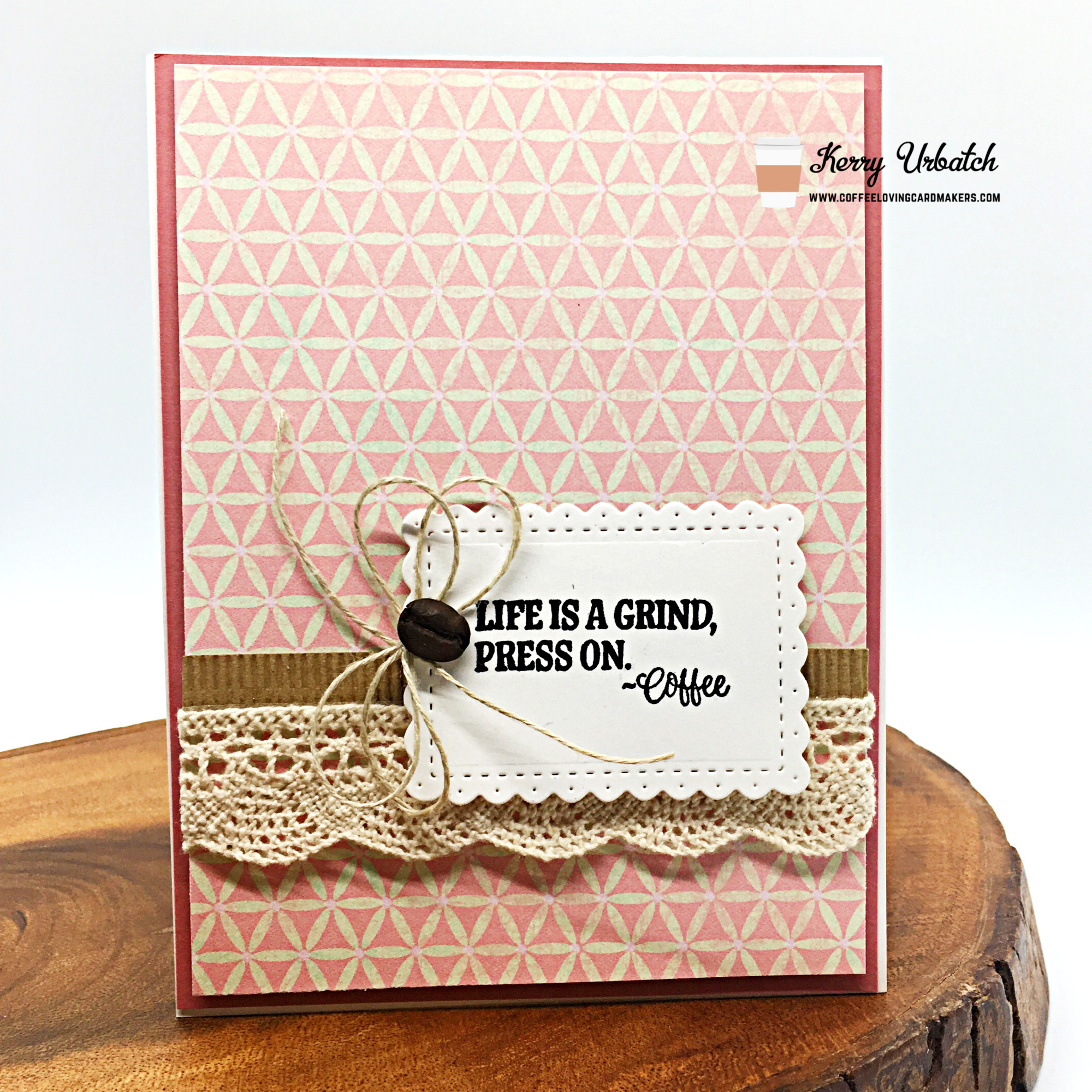 Hello there Coffee Loving cardmakers!  It’s Kerry here and I’m back with another Sunday Sip!  I hope today finds you happy and healthy! This week, I’m keeping it simple with a little extra fancy lace thrown in.  You see, I had this old printed paper that reminded me of an old quilt so  I wanted to add a little fiber love to help it feel nice and cozy.