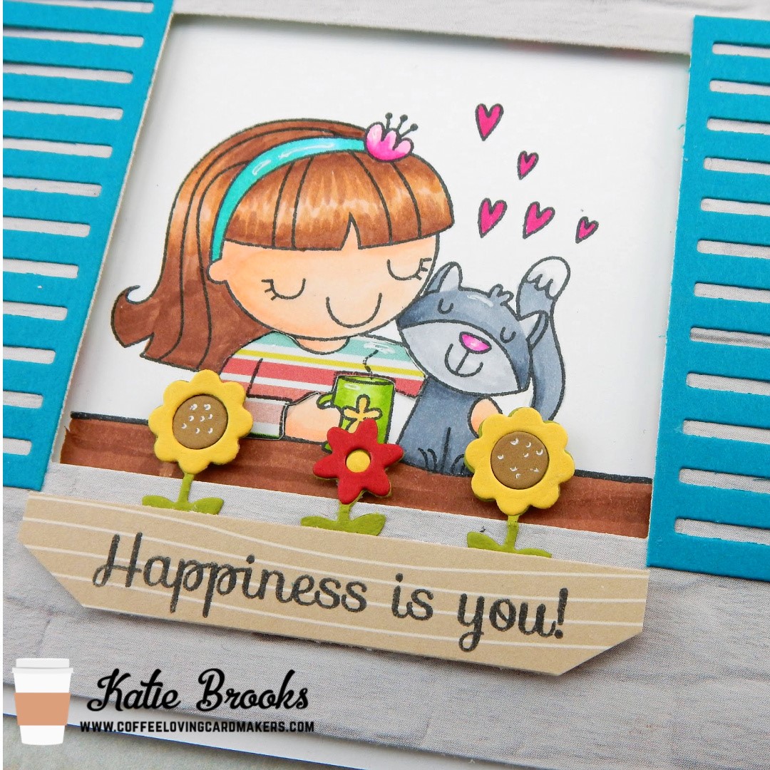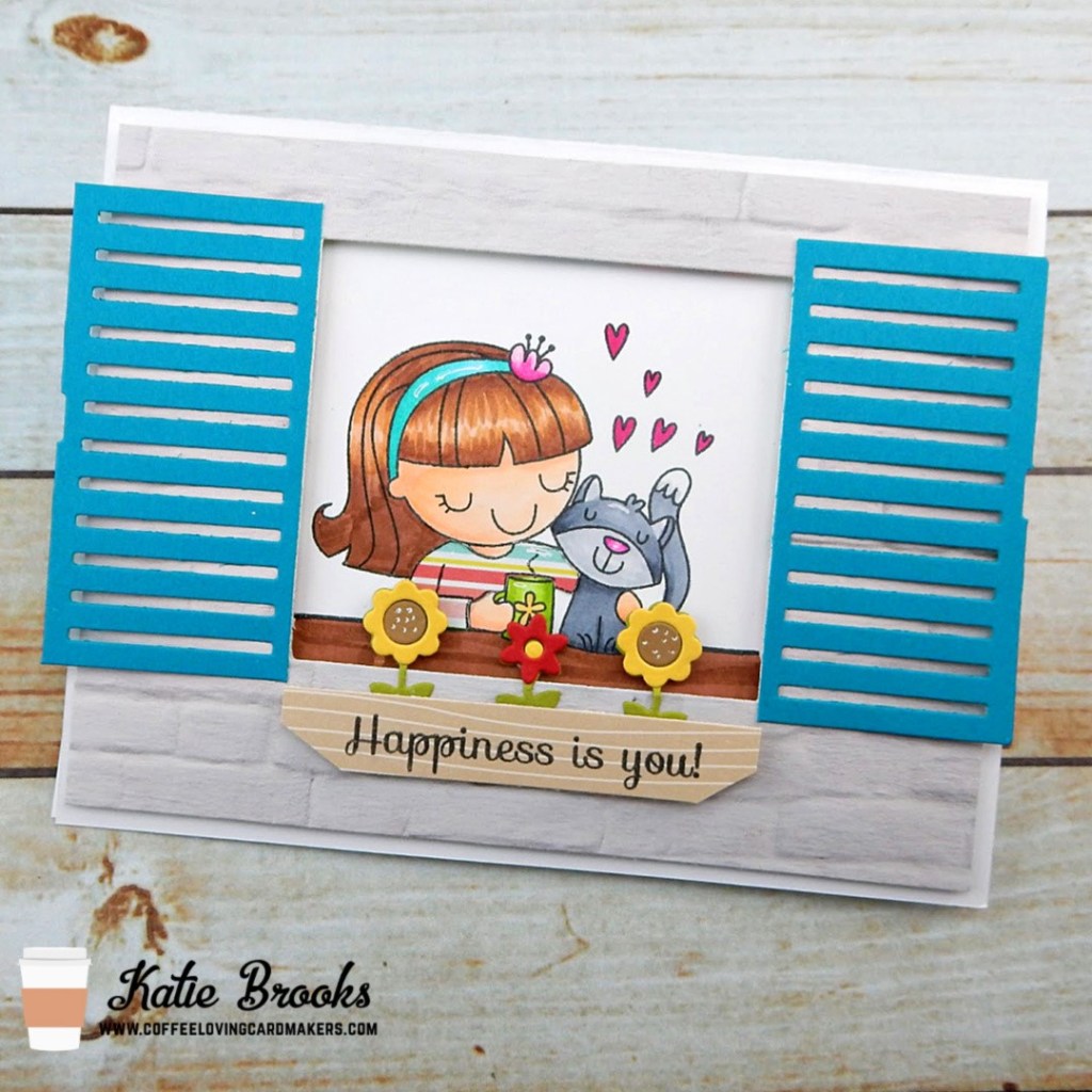 Don’t ya just love it?! I love the DP that is a brick facade and the window box with flowers and the shutters I was just talking about. Of course the sweet image is the star of the show. I colored with Copics and I paper pieced the shirt. I hand cut the window box with some woodgrain paper. The flowers are from CDD. The shutters die cut in the middle closed, but I wanted them open. The blue paper was bright and fun.