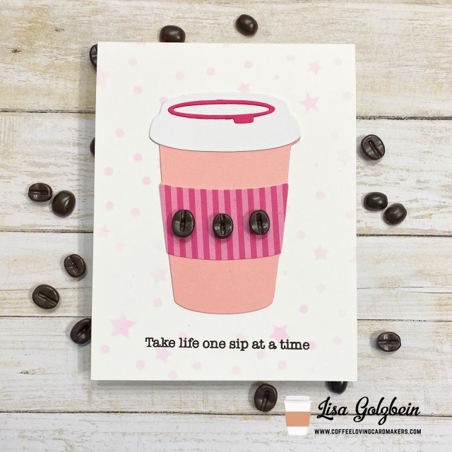I used the Circles and Stars stencil from The Rabbit Hole Designs on my card base and I went with a light pink calming color to match my coffee cup.  I just love the Kat Scrappiness Layered Coffee Cup die for my to go coffee cup cards! I prettied it up with some pink striped patterned paper and then for some extra fun I glued on some Coffee Bean sprinkles from Kat Scrappiness as well!