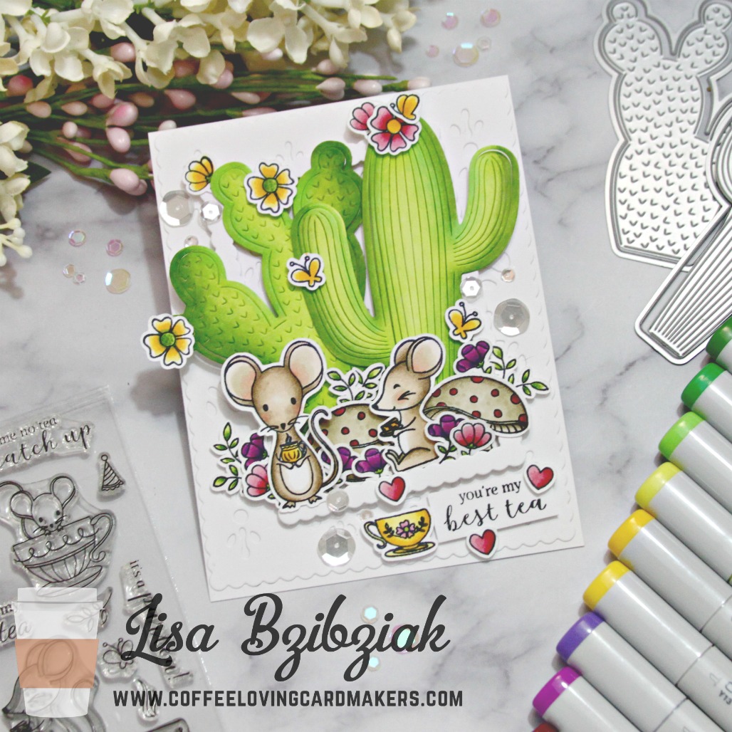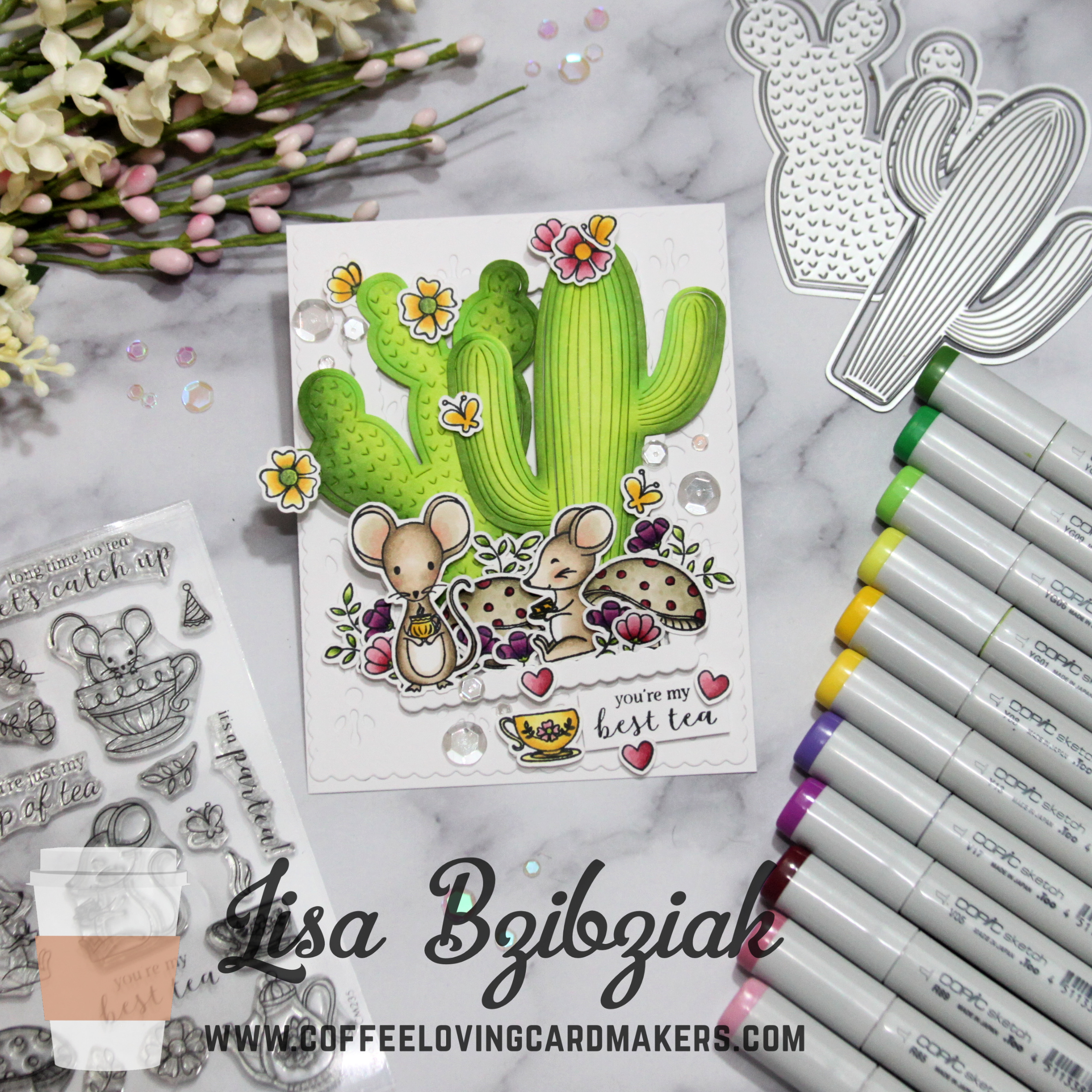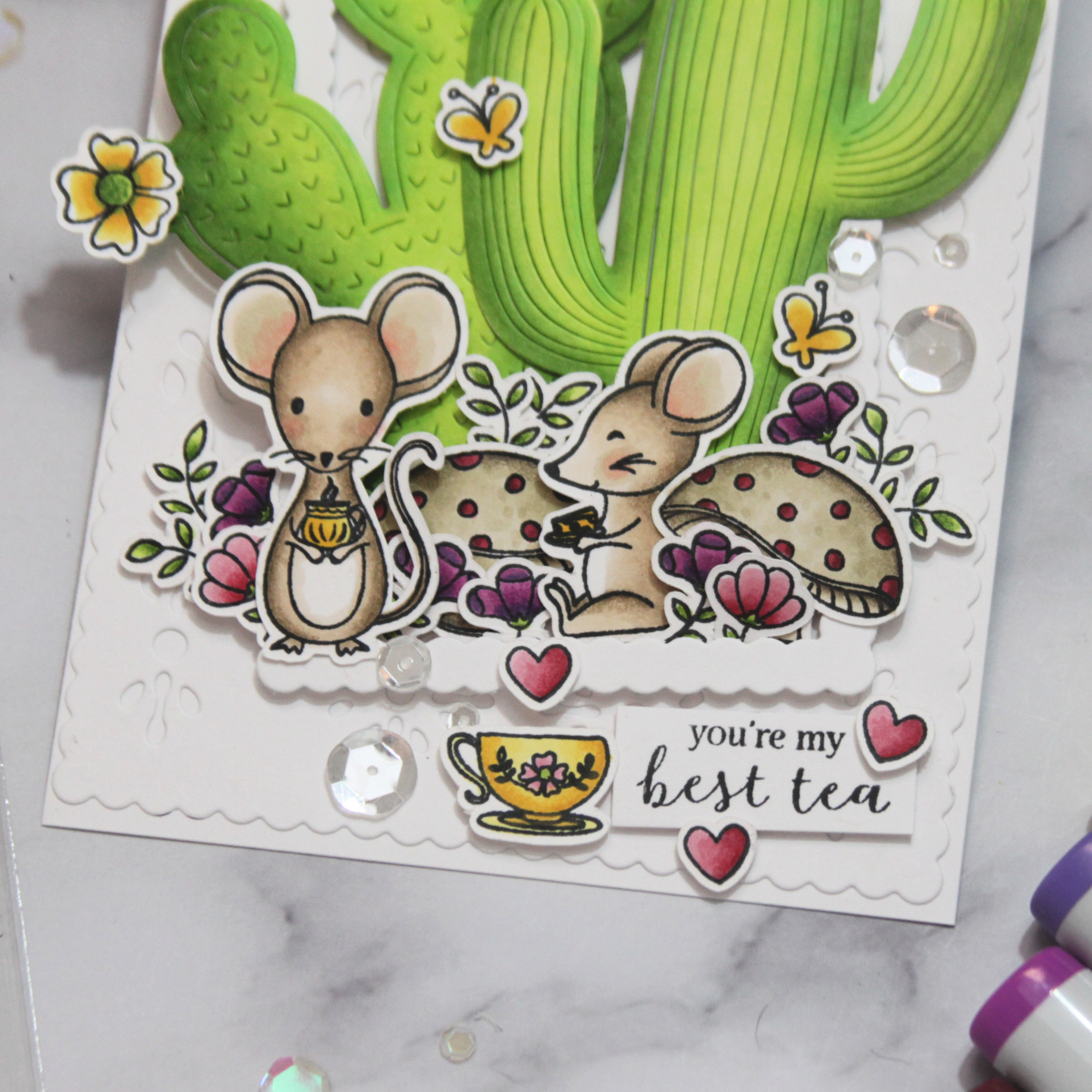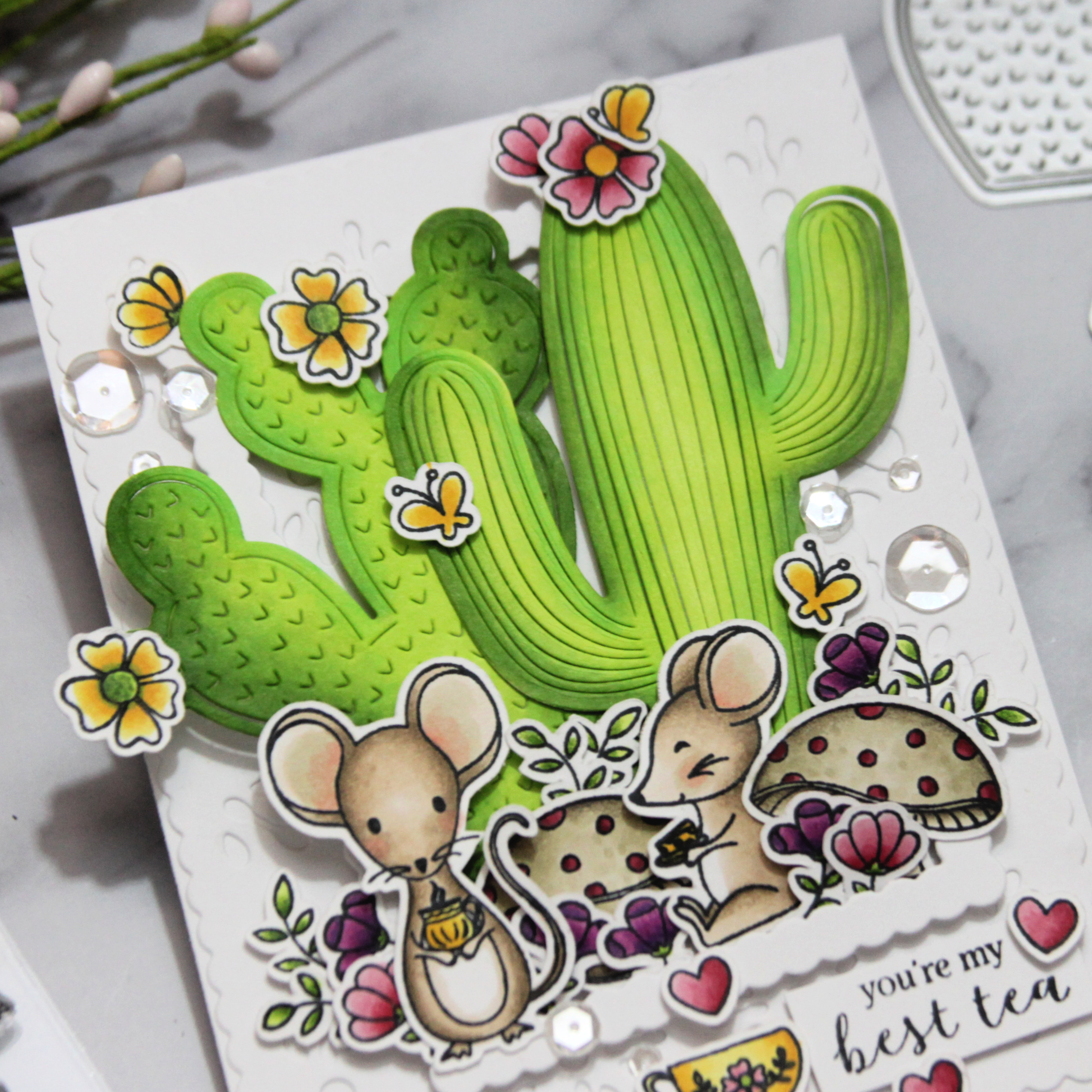 Those cacti are so cool! Unfortunately like the Mouse Tea Party set they are retired, however with a Google search I bet you can find them if you want them! I thought that the lines and “v”‘s in them were just embossing, but they are cuts and there are two parts to the dies… if you want to cut it out of your paper you use the outline die or you can cut it without and it just cuts the outline and texture lines, but . I just lined it up and fastened it with some washi tape before I ran it through my Gemini. I cut them out of Copic friendly paper and colored them in with my Copics… and in case you want to know, I used YG01, YG03, YG06 and YG17.