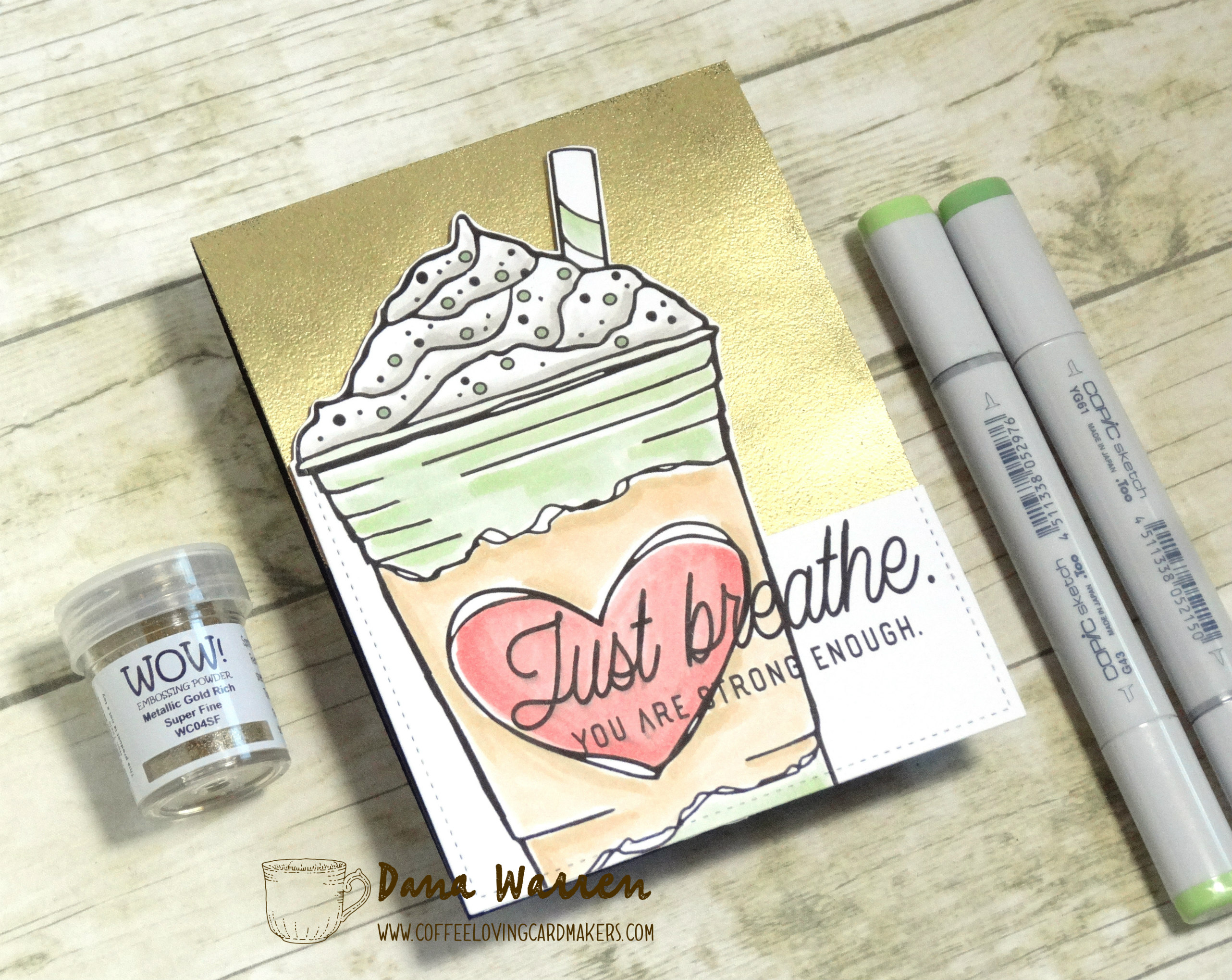 I made a card base from black card stock (not that you can see it!) and then added some versamark ink to the card base. Then I heat embossed some Wow Embossing Powder Metallic Gold. Last, I added the colored image to the card with foam tape.
