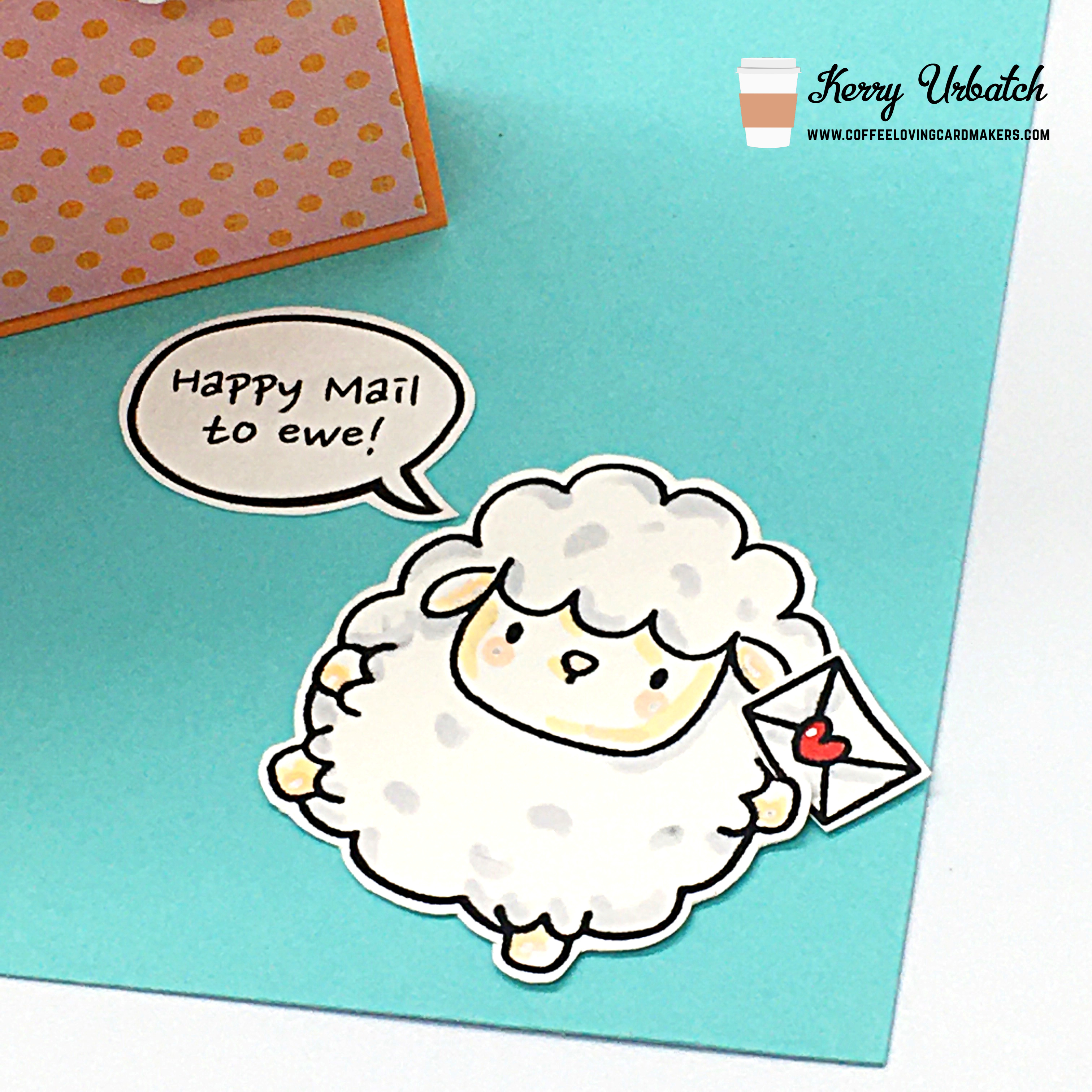 After mounting this panel onto an orange card base, I stamped another little sheep and the envelope and attached it to the front of a Gina K Sea Glass envelope. I’ll be addressing the envelope nice and fancy and then to secure the sheep, I’ll add this card (and matching envie) to a special treat box that will go with this happy mail! PERFECTLY FUN!
