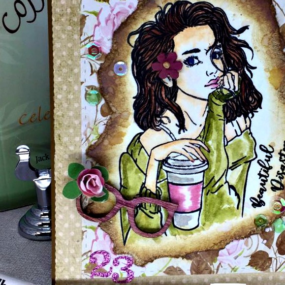 I added some Pretty Pink Posh sequins and I found the little glasses in my stash. The flower is from a fellow crafter. I made this card for my daughter Emily’s 23rd birthday.
