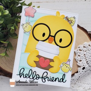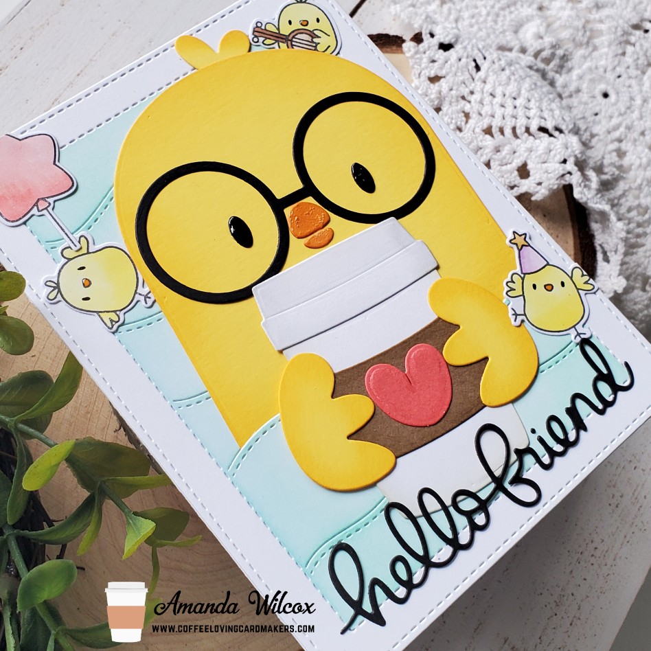 The background looked too stark all white so I masked the edges off and inked the middle up with cracked pistachio distress ink for a subtle something. I added that to a card base and started adding pieces. I tucked the big chickie in place and glued the cup and hands down. Then I added the small chickies and realized I didn’t plan for a sentiment. Oops. I tried a few stamps but it didn’t look right so I pulled out my hello friend die and cut it out. I added this with my quickie glue pen (I love this for skinny little pieces like this.) and moved on to finishing touches.