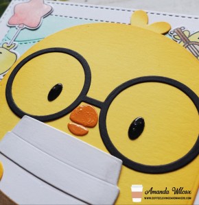 I added glossy accents to all the chickie’s beaks and the big chickie’s eyes. I used black glaze pen on the little chickie’s eyes and then wink of stella glitter brush pen to the cup’s heart and the balloon.