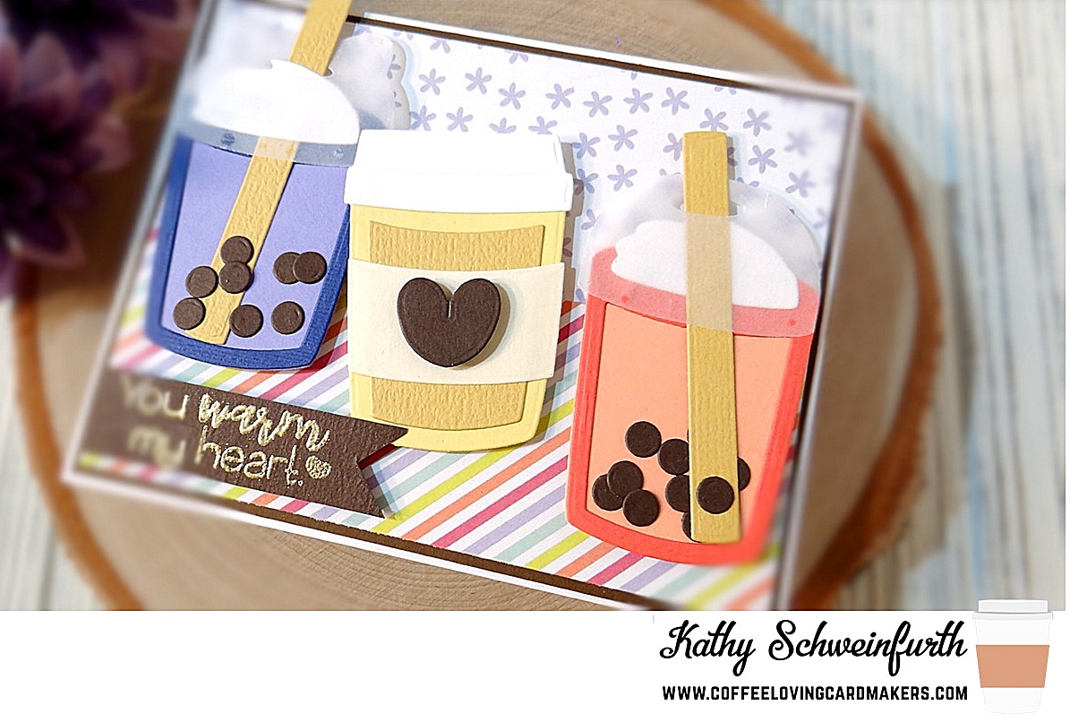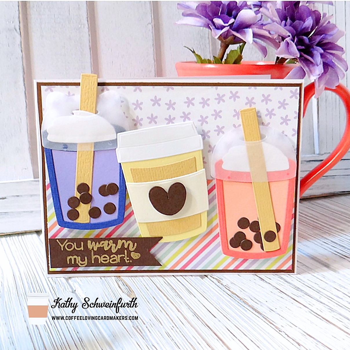 For the background, I first layered dark brown cardstock to the card base then used two patterns from Paper Smooches Rainbow Sherbet paper pack. These adorable diecuts were created using Mama Elephant Boba Tea Shaker Combo dies…so cute!