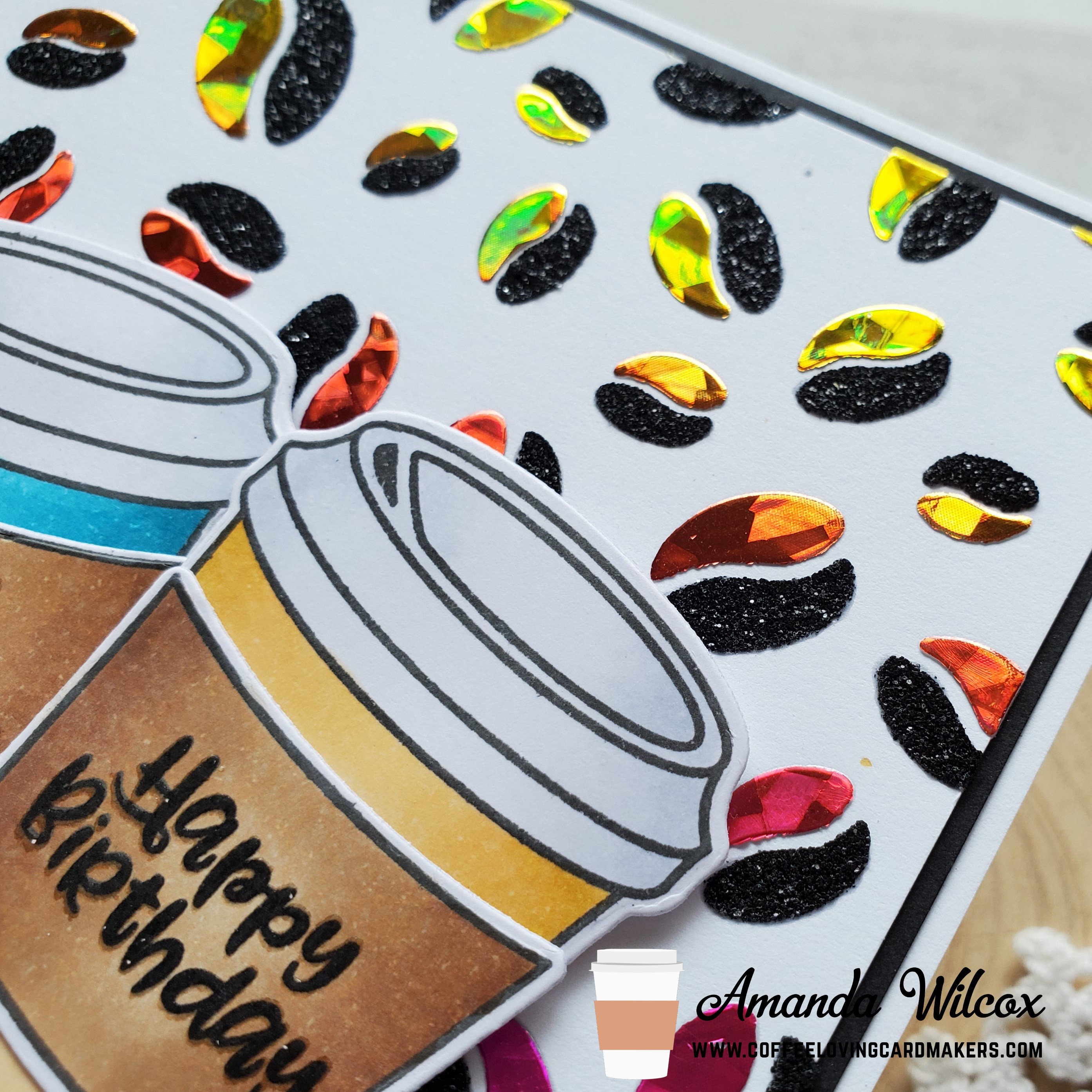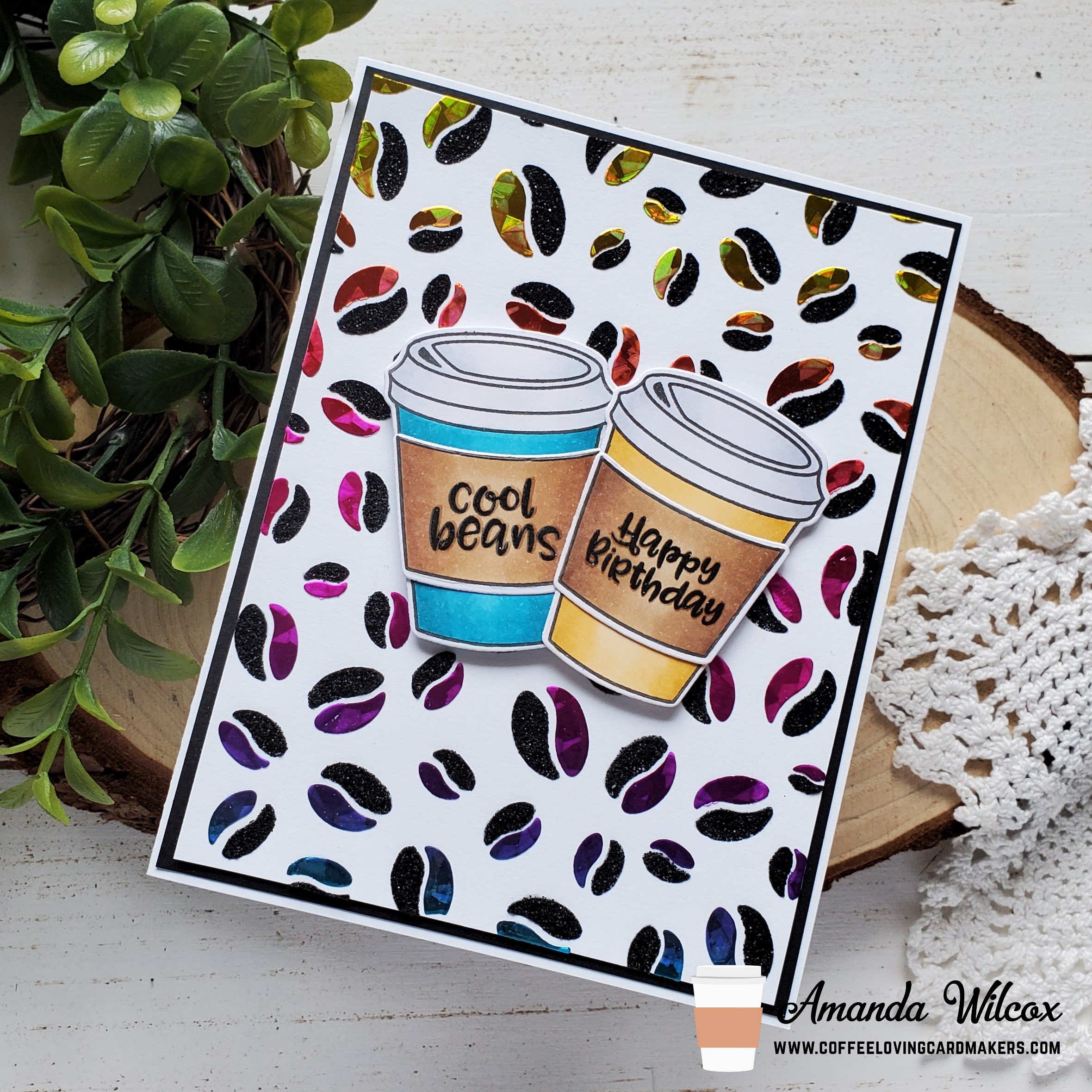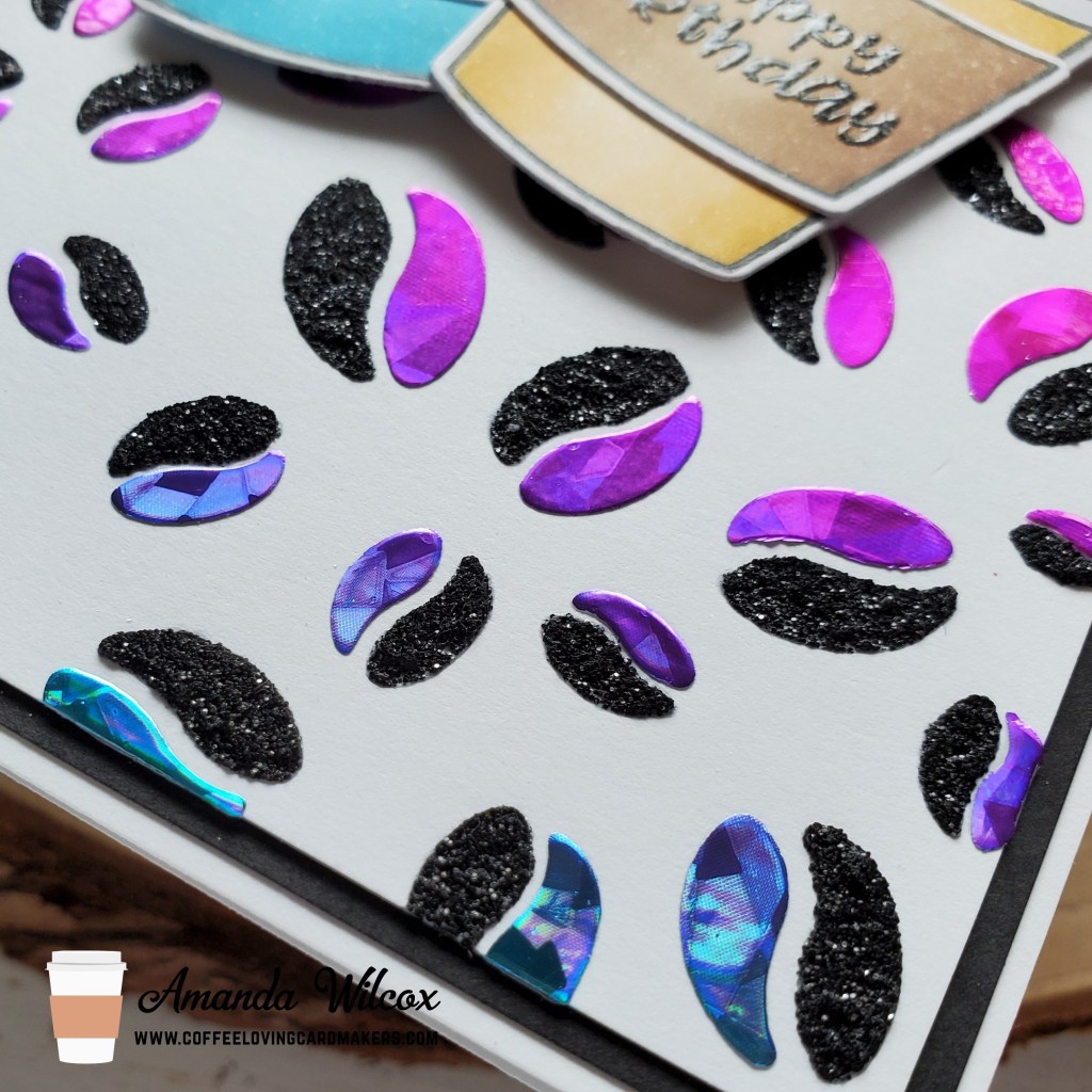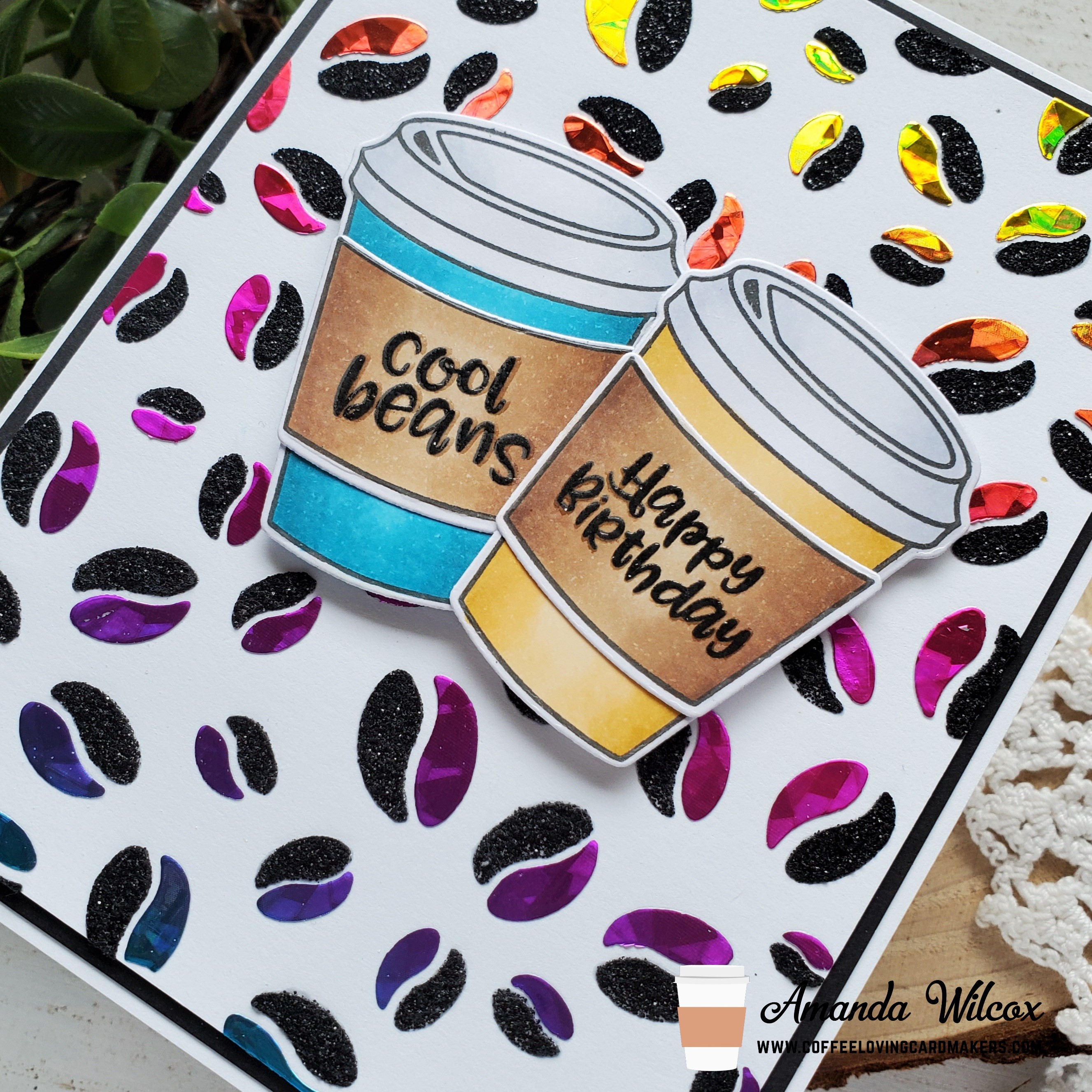 To make this fun card, I started with the background by using Thermoweb transfer gel on the first layer of the Trinity Stamps coffee bean stencil. I let it dry overnight and came back with rainbow shattered glass deco foil. Then I lined up the second layer of the stencil and used black glitz glitter gel on the other half. I just love how this turned out!