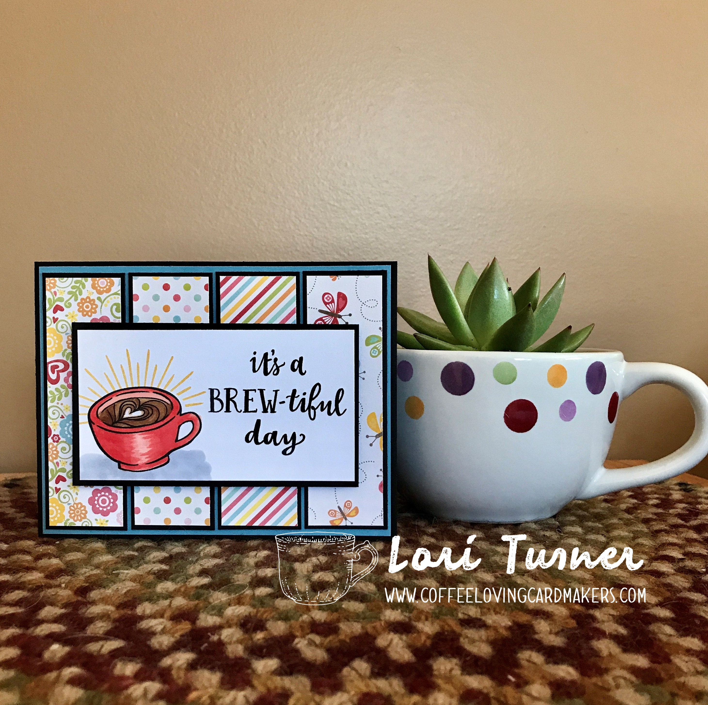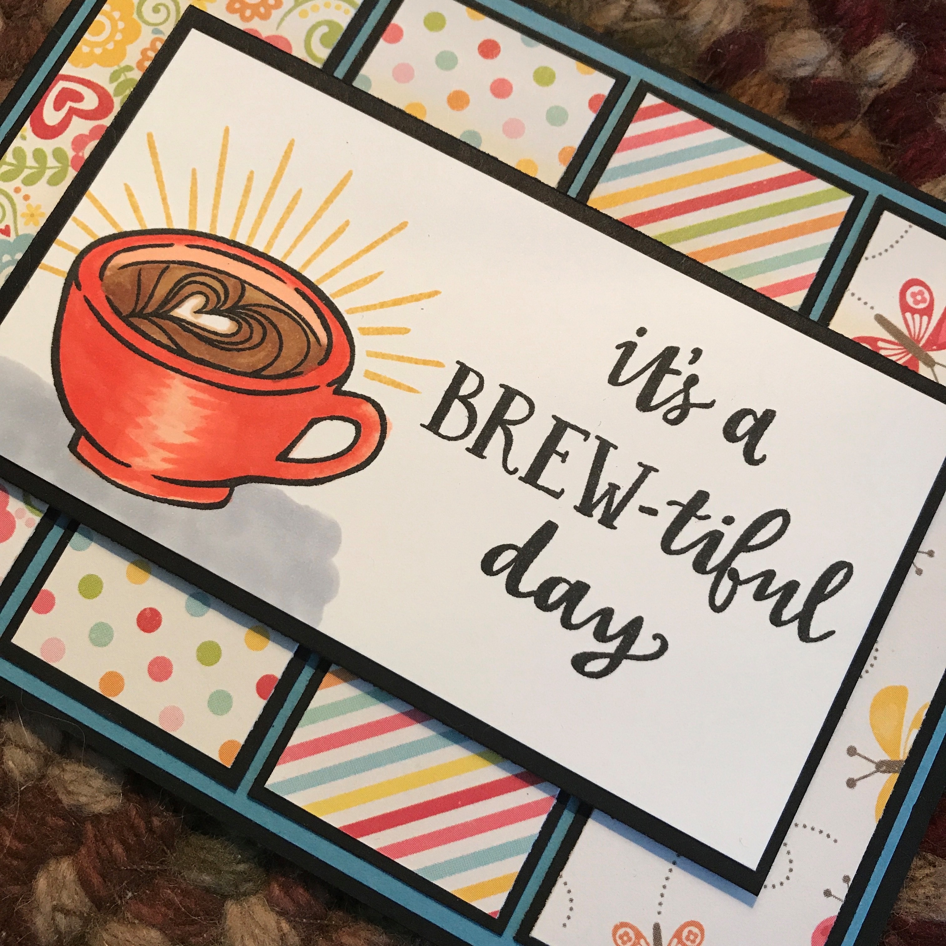 I stamped the sentiment and cup from the Drink More Coffee set and then colored with copic markers and layered the main panel on top of some fun designer paper strips…so fun!!