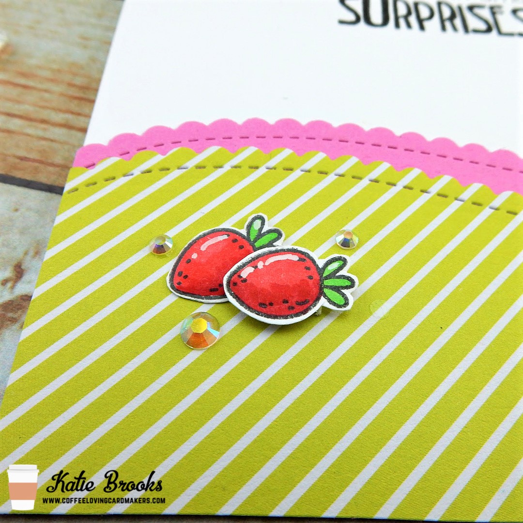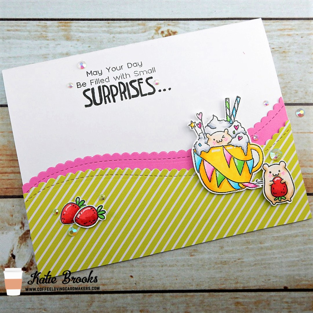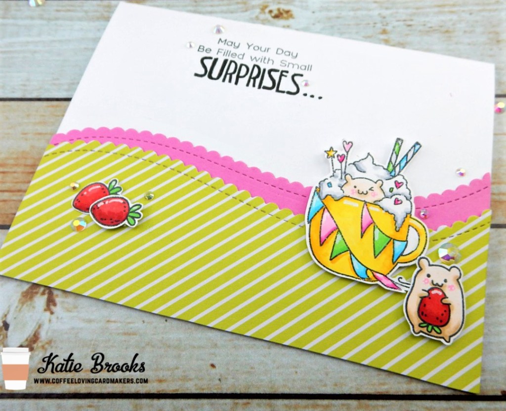 Here is today’s happy and bright card.  I quite love these images from The Greeting Farm.  Fellow DT Kerry turned me on to this particular set, she used it and I went right out and purchased it. It’s called Small Surprises in case you want it too. 😉