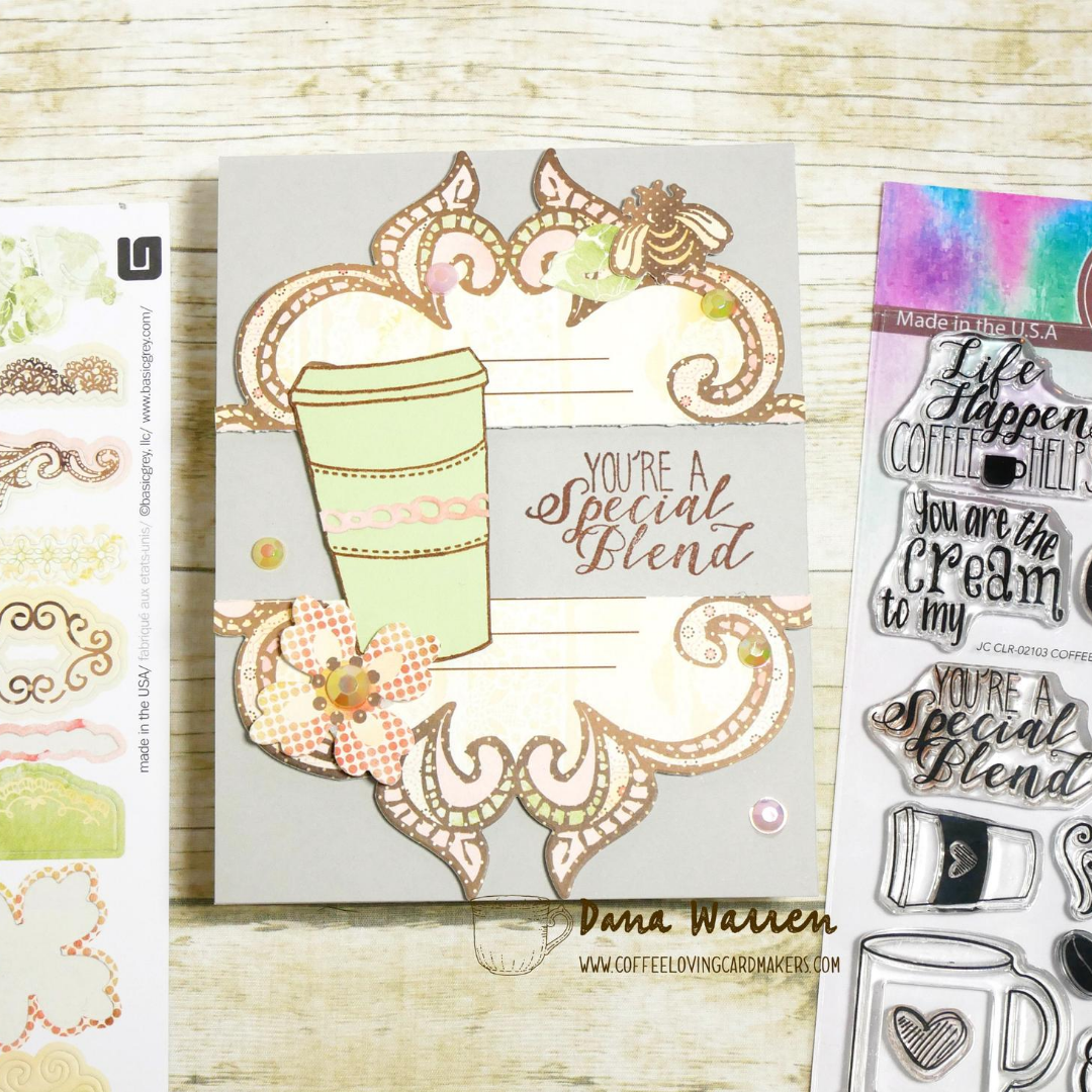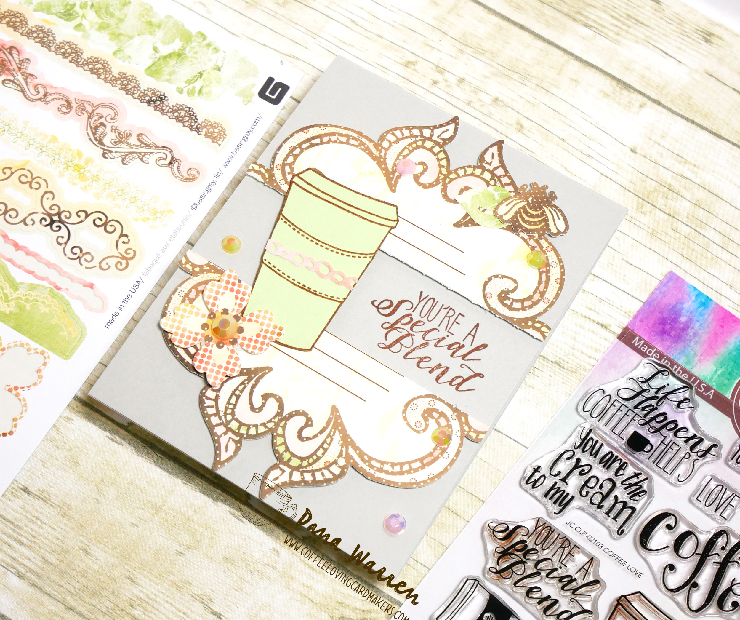 From the sticker sheet I picked out a big journaling sticker and cut it in half. I placed it on a gray card base and played around with the placement. I picked out a few coffee stamp sets to play with before settling with Joy Clair Designs Coffee Love stamp set. The set must be retired as I don’t see it on their website, but they have a lot of coffee themed stamp sets you can check out here!