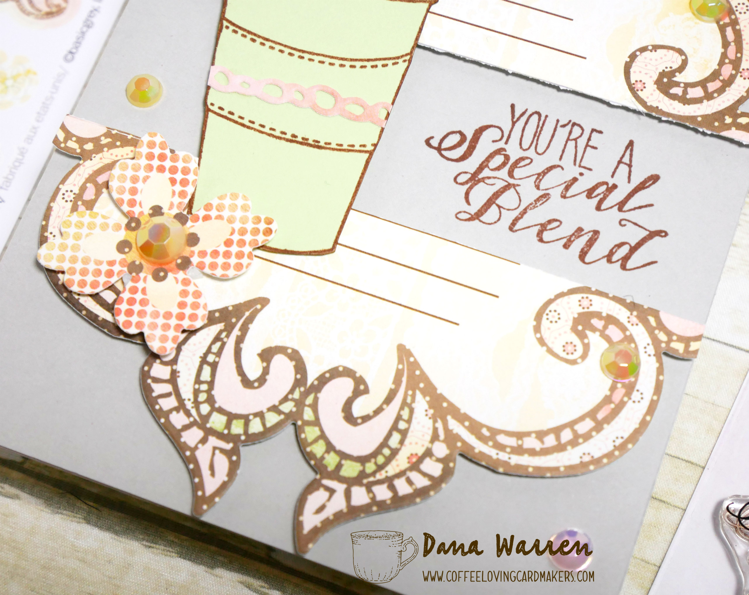 After adhering the two sticker half’s to the card I added the coffee cup. I thought the card needed a little more so I added a sticker flower and bee along with a few matching rhinestones.