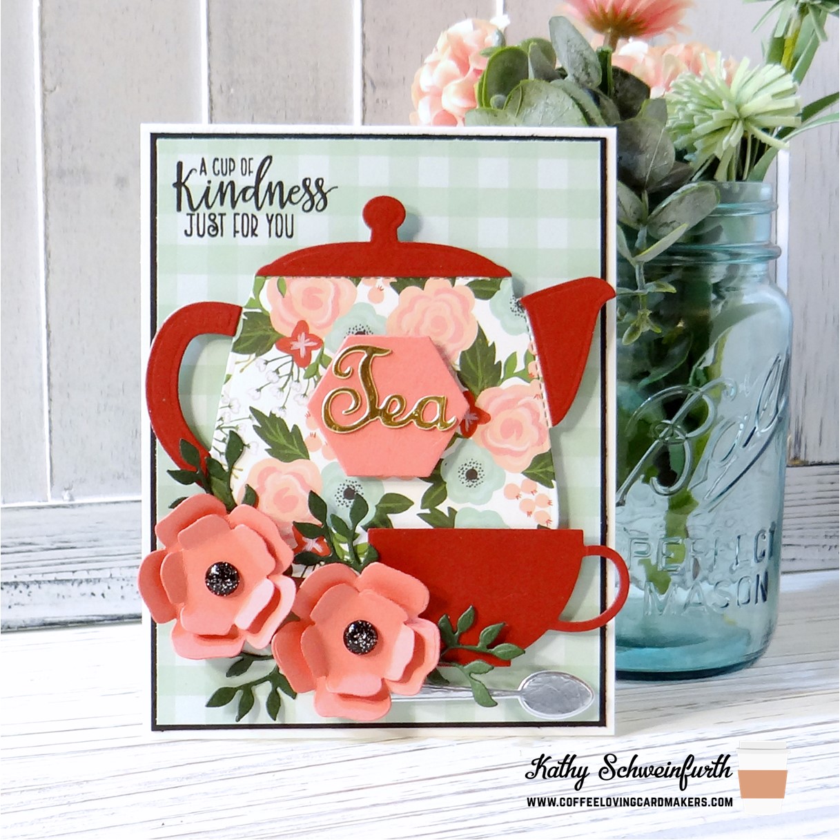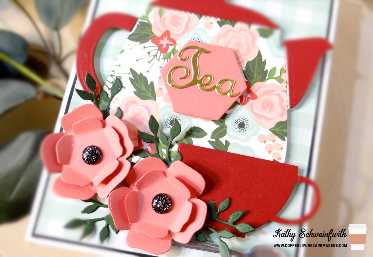 To finish, I cut RC Flamingo cardstock with Pink & Main’s Nested Hexagon Dies. The ‘tea’ word die was cut from shiny gold cardstock using Spellbinders Cuppa Coffee dies.