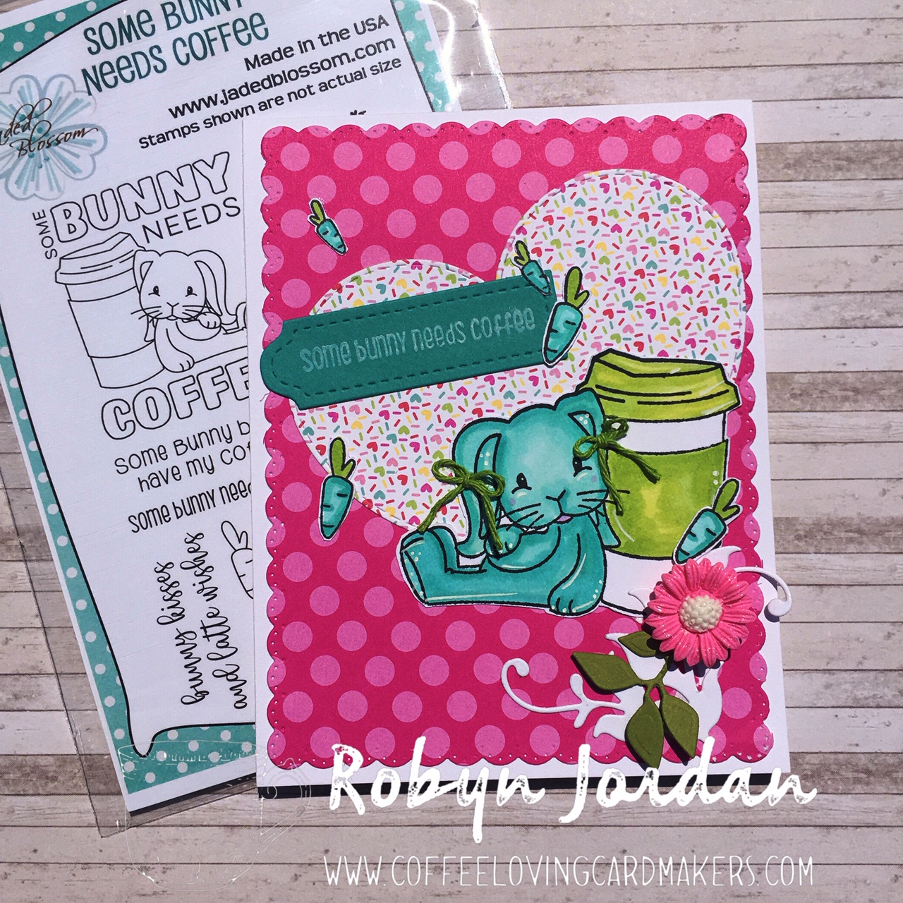 I am back today with this super fun card made with Jaded Blossom’s new caffeinated set called Some Bunny Needs Coffee.  So cute!