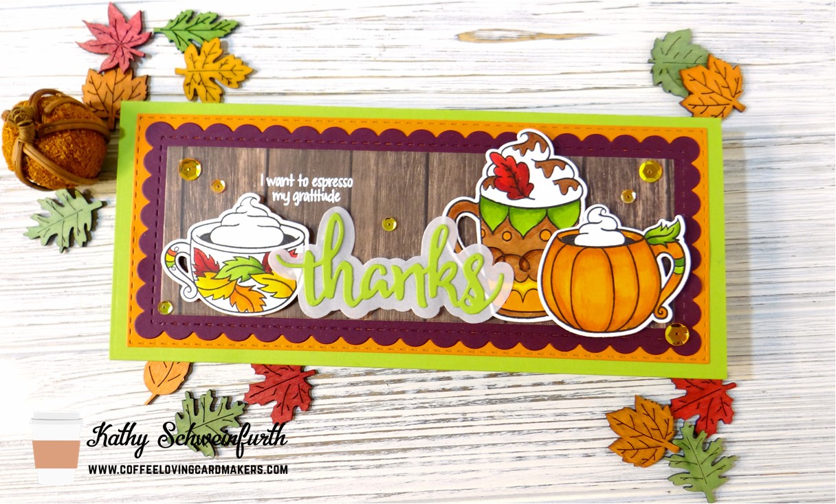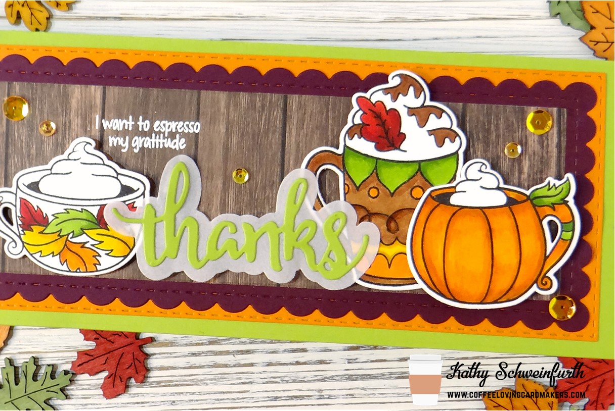I adore these fun cups from the new Need To Venti stamp set with coordinating dies.  Aren’t they awesome?!  To finish, I white embossed one of the sentiments in the set then used the Thanks Dies; cutting the shadow from vellum and the word from lime green cardstock.