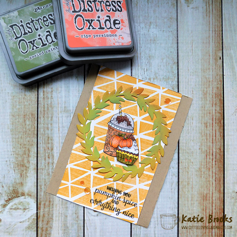 For this card I used Pink and Main stamp set that is retired and Wreath Base Die. I stamped the images on white and colored them with my Copics. I used YG95, YG97, BG10, C1, C3, E23, E25, Y13, Y15, YR02, YR16, YR07 and blender. On the wreath, that was cut in green Cardstock. I used Ripe Persimmon Distress Oxide on the outside and Peeled Paint on the inside using my Blending Buddy. I mounted the wreath and cup on this bit of cardstock. I placed the images in the middle. I added glossy accents to the top of the cup. I stamped my sentiment and and added some Autumn Leaves Embellishments. I mounted this all on Kraft paper.