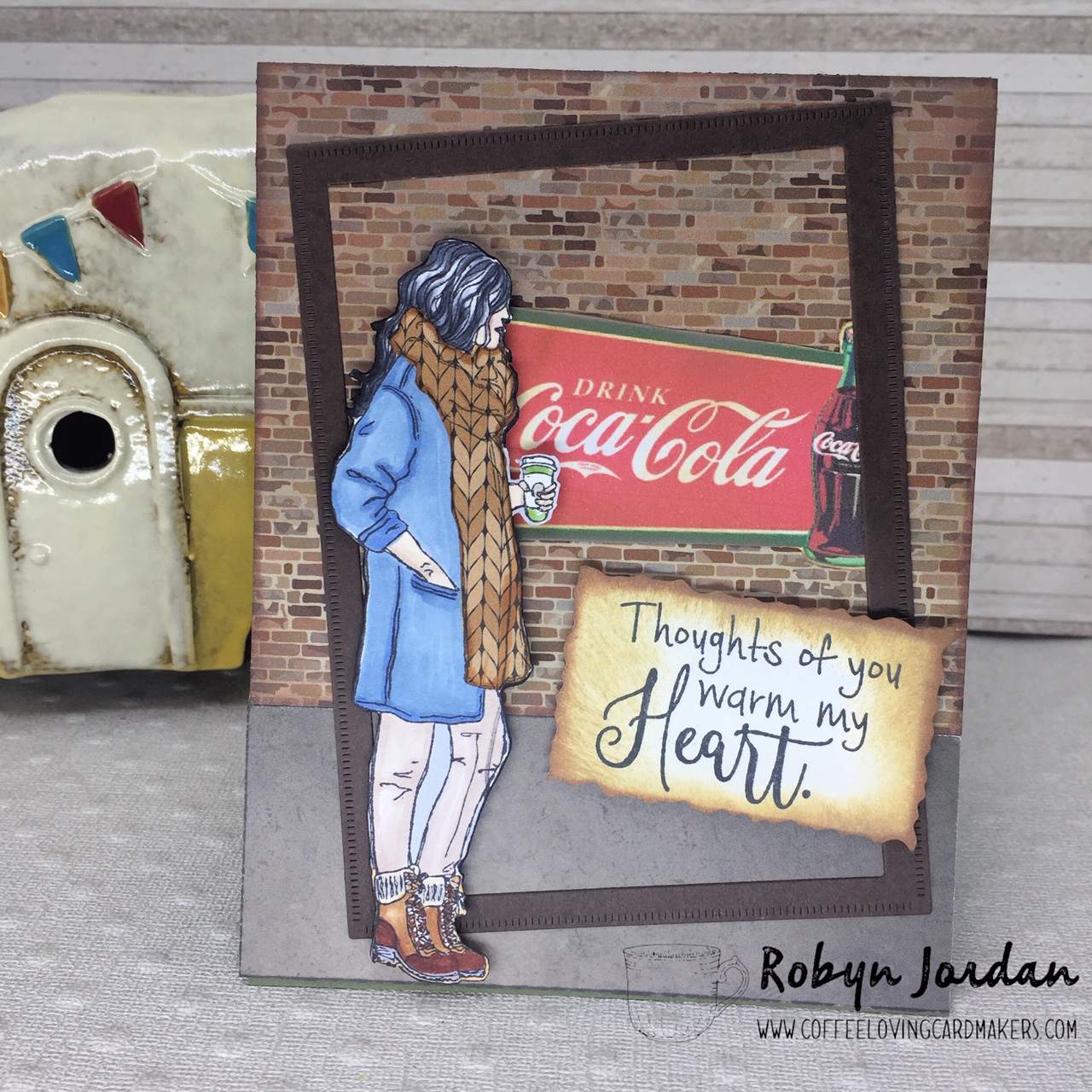 I was so excited for my friend Jeanie Hays! She has become one of the newest illustrators for Unity! This pretty girl is simply called Fall Gal. I colored her up quickly with only a few Copics and did a little paper piecing on her scarf. I fussy cut her out and thought, let’s get creative!