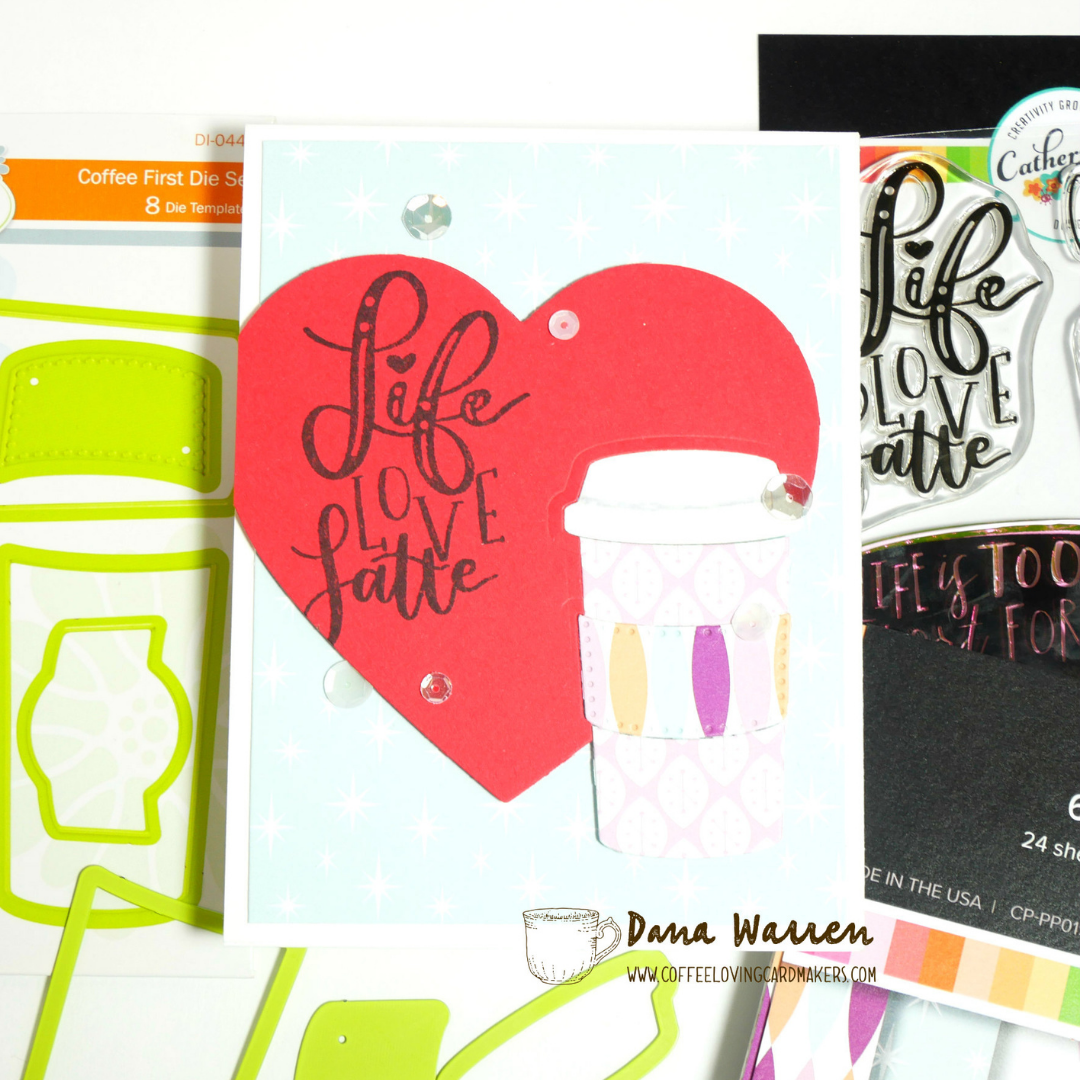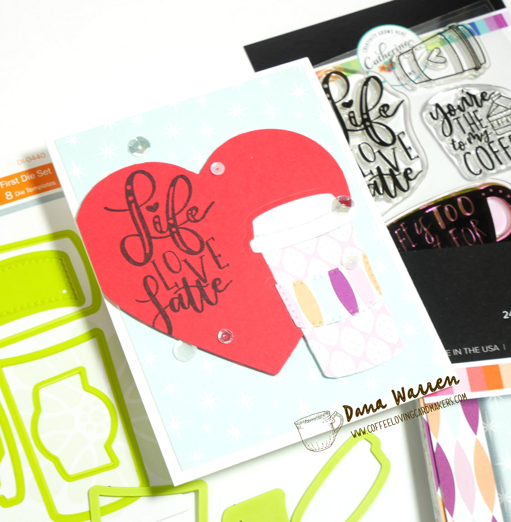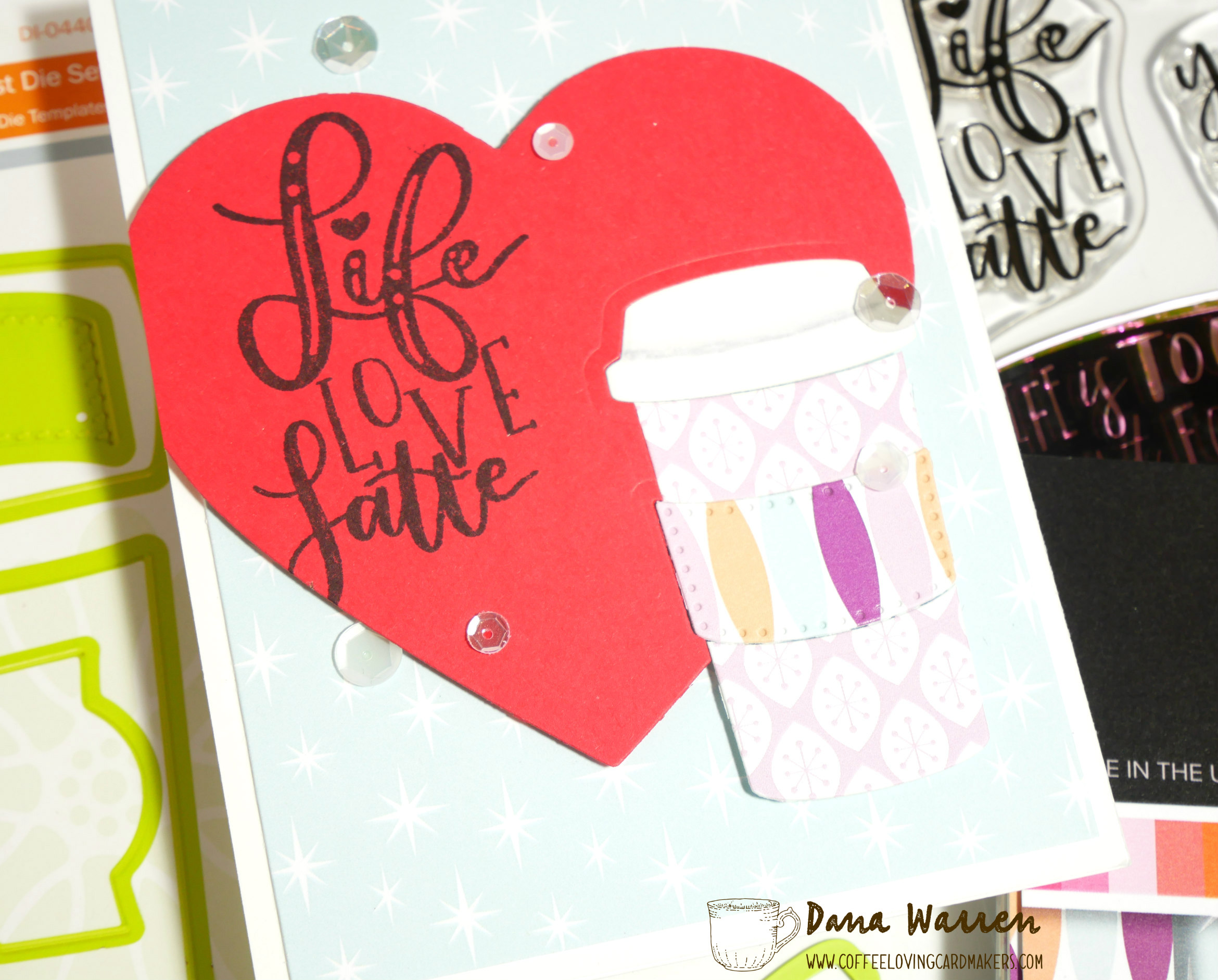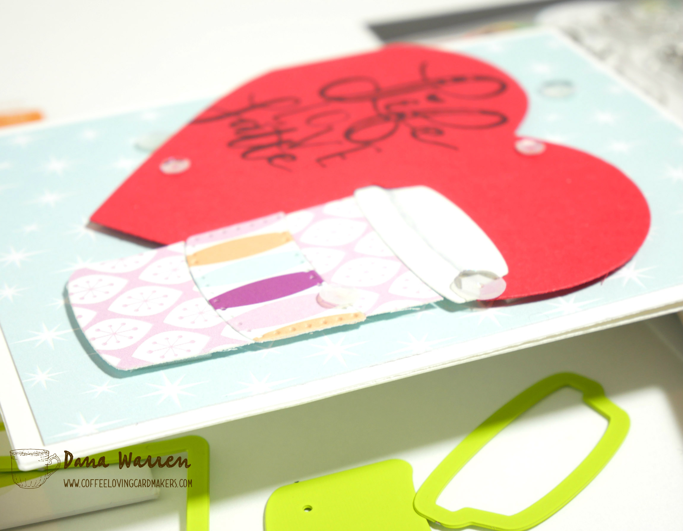 At this point I decided to add my heart and coffee with foam tape. So I trimmed some pattern paper and adhered it to a white card base. Then I just added the heart and coffee cup with foam tape matching up the pieces like a puzzle. The heart and coffee cup are all one layer!