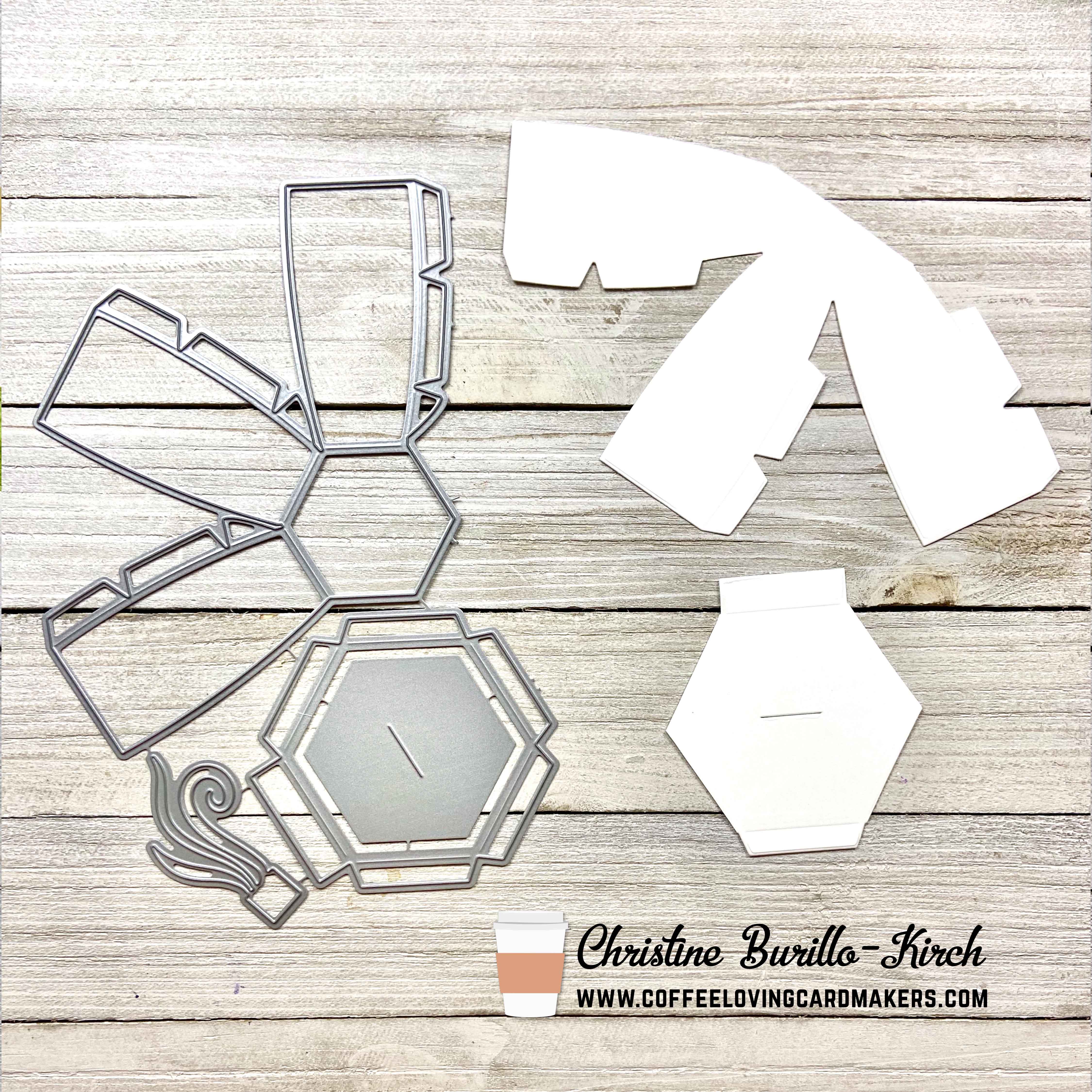 First I die cut the parts of the treat box as it was intended, and then cut parts off with a scissor so that I had die cuts that looked like what I have in the photo below. I cut the three smallest tabs off the main part of the cup and half of the bottom hexagon off (on and near the bottom of the cup)- you will need to do this to both die cuts (you need 2 of them to create the 6 sided cup). Finally I cut 4 of the tabs off the top part of the cup that has the stamped image (see final card) of the coffee & cream. All the other die cuts needed to assemble the cup are kept the same; this allows you to actually close the card. To see how the cup is normally assembled please watch the video located here.