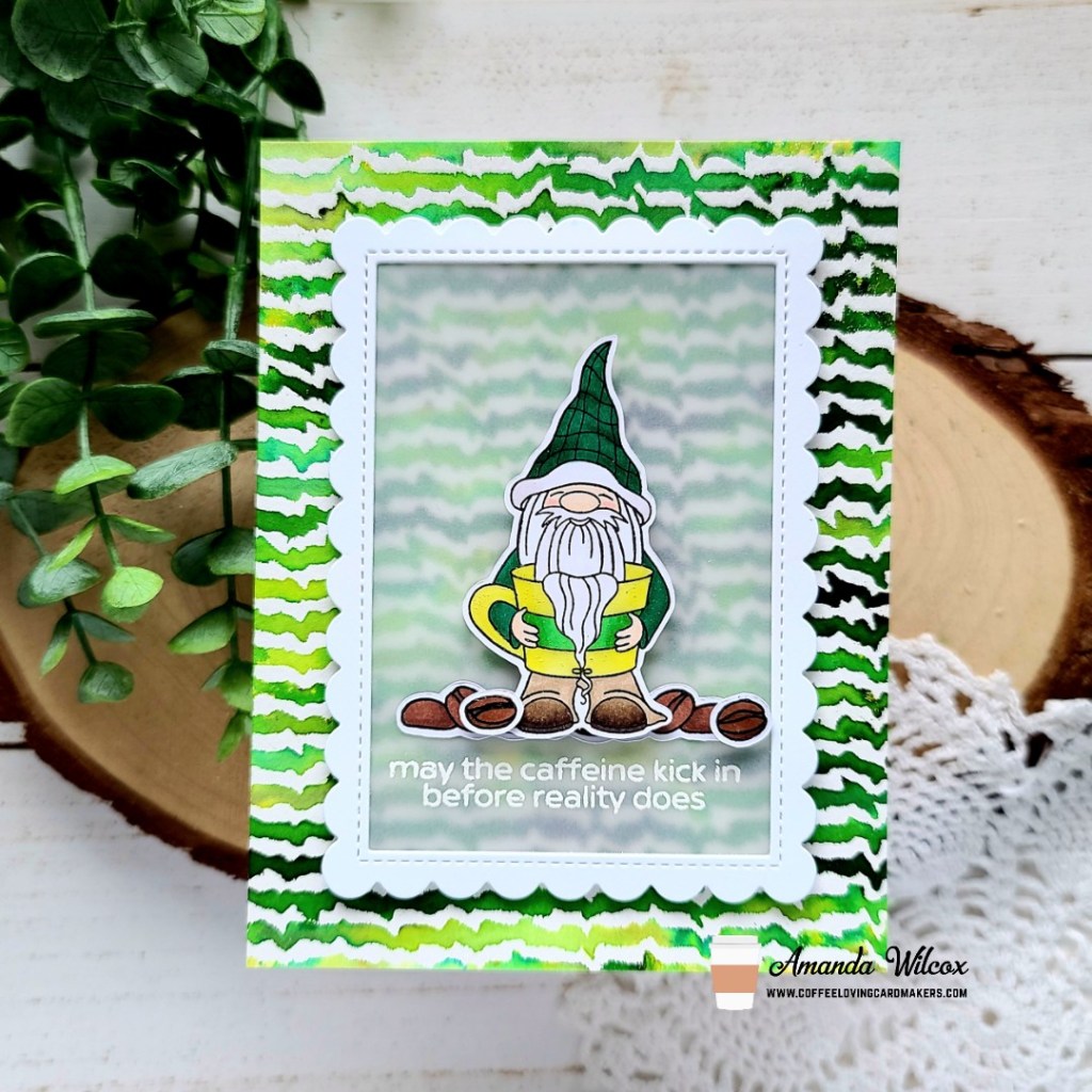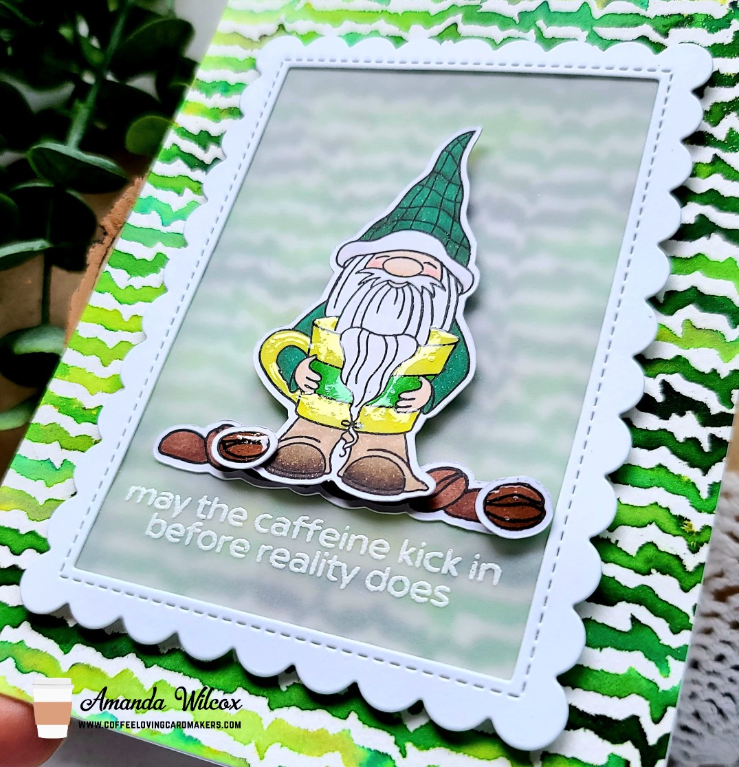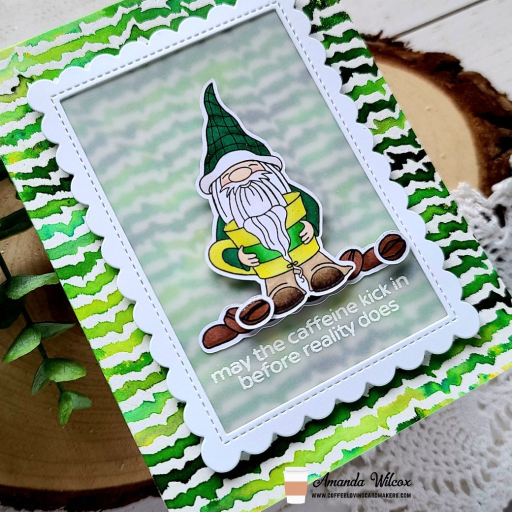 Obviously, I started today’s card with the background. I took watercolor paper and laid my Miss Ink Stamps Jitters stencil over the top. Then I sprinkled powdered watercolor over the stop and spritzed it with water. I carefully removed the stencil and smooshed another piece of watercolor paper on it for the negative so I have another background the play with later on. I set those aside to dry and stamped out my images which are also from Miss Ink Stamps. They are from Big Mugs and Brewtiful. I colored them with my copics and used the scan-n-cut to cut them out.