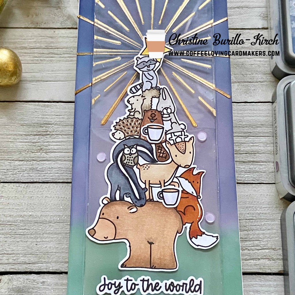 Hi there, Christine here. Years ago, I made a card with a Christmas tree that was covered in coffee cup embellishments, and while today’s tree is not a standard tree, I wanted to include coffee cups on it. The end result is an interactive slimline slider card using products from Super Sponsor Trinity Stamps. I usually try to have coffee be the focus of the card, but today’s card has coffee as a decorative accent. I used the Trinity Stamps Treemendous stamp & die set, Shine Brighter stencil set and the Slimline Surprises die set to create the card.