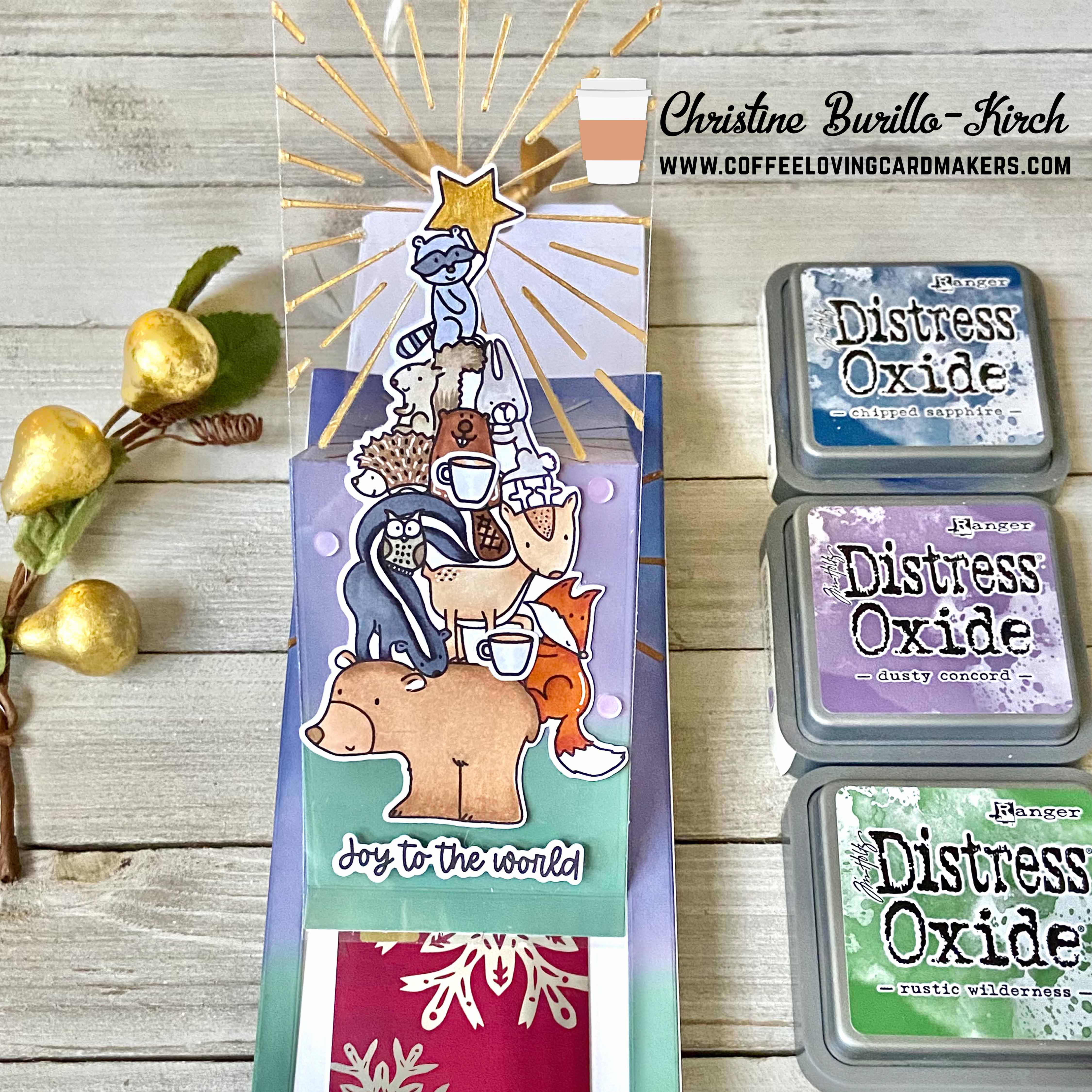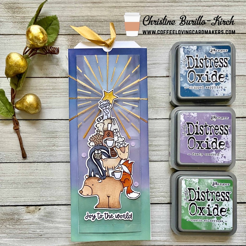 I die cut the slider mechanism out of 110lb Neenah solar white cardstock and heavy weight acetate (Lawn Fawn). I ink blended several distress oxide inks onto the panel: new color rustic wilderness, dusty concord and chipped sapphire. I was going to heat emboss onto the acetate, but instead used Dreamweaver metallic gold embossing paste on the Shine Brighter stencil set ; I did the same with the ink blended panel and set both pieces off to the side to dry. I had originally intended to use coffee at the top of the tree, like I’m using my watermark below, but I couldn’t get it to look right, so I didn’t end up using it.