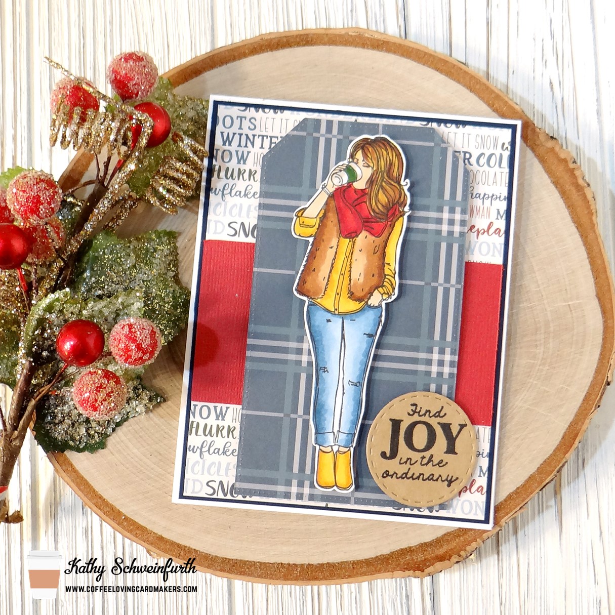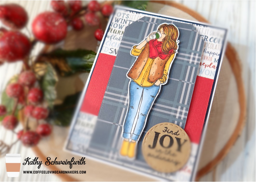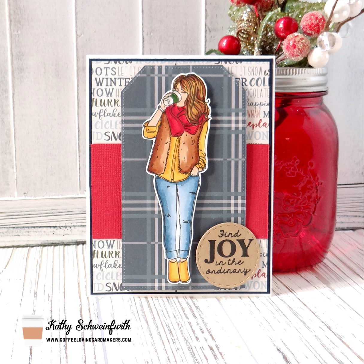For my card, I used a couple of pattern papers for layering. This fab image and sentiment are from Unity Stamps Brystl Girl set designed by Angie Blom. I don’t have very many Unity stamps, but I do love their images – especially Angie’s designs! Simple card, yet I enjoyed the time coloring the image while sipping on my own cup of java!