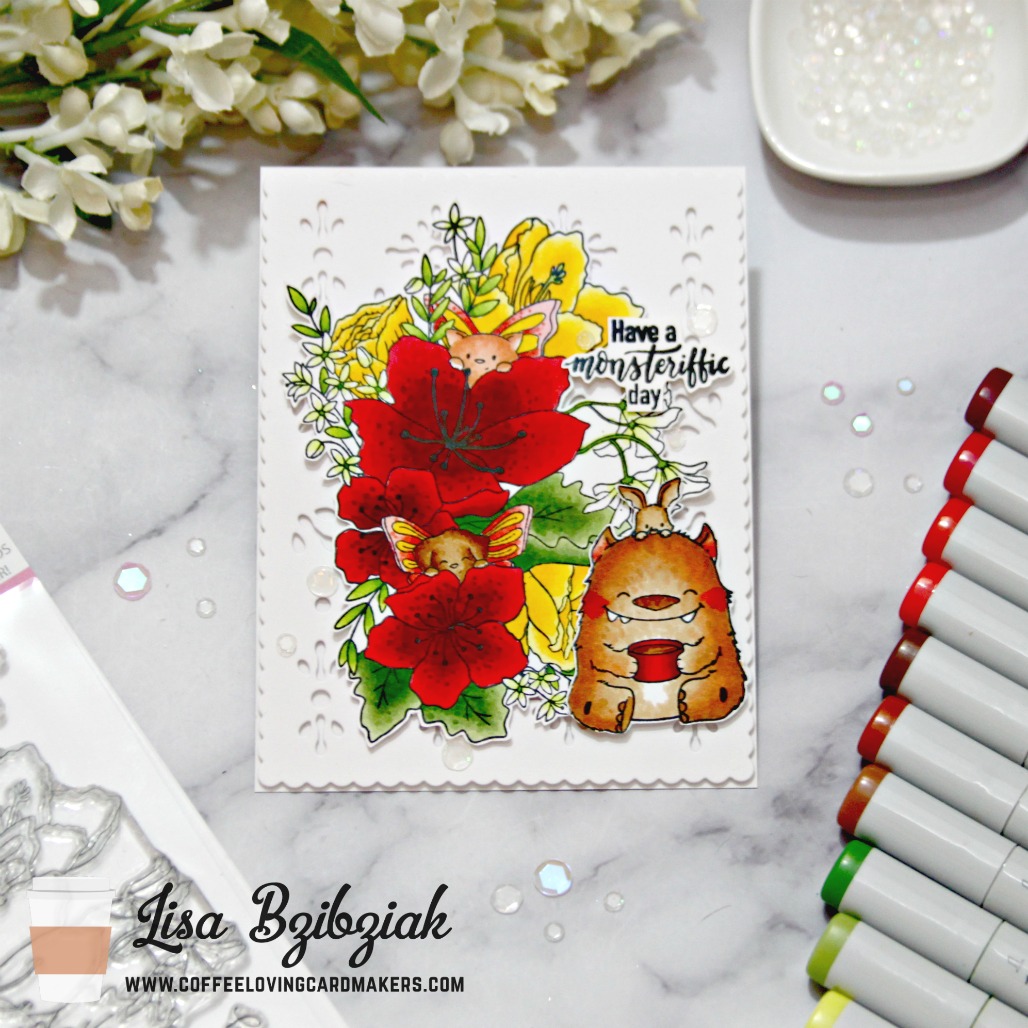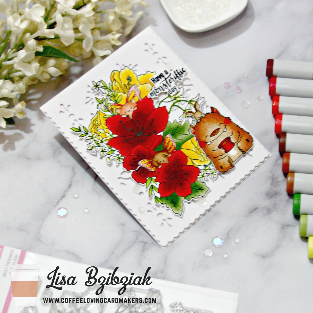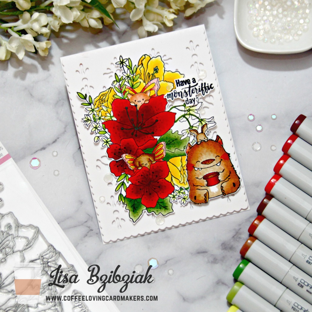 This time I used the adorable Monster from Best Friends Fur-ever set along with the Floral Surprise set. I was feeling like some deep rich reds so I colored up these tropical flowers with some of my faves.