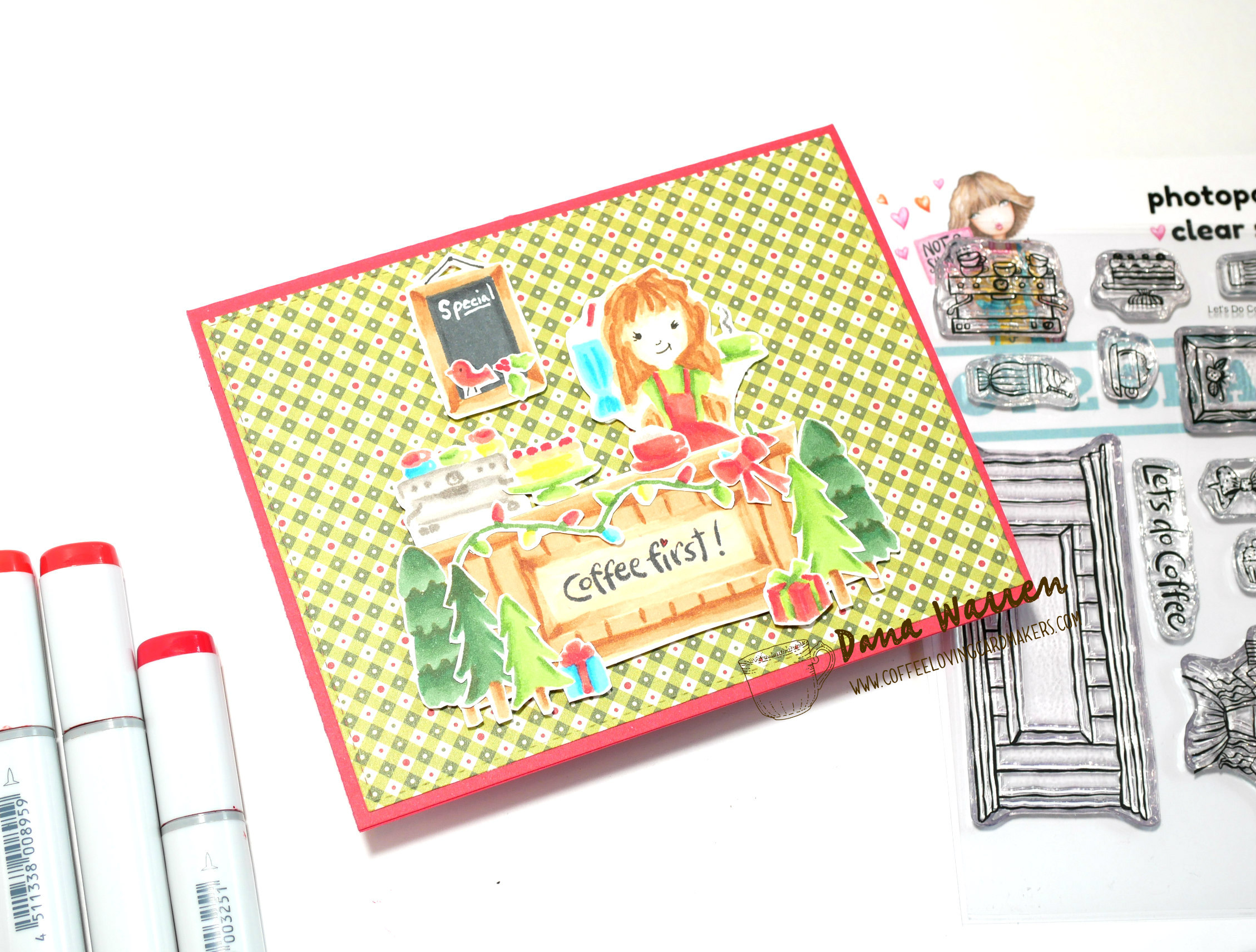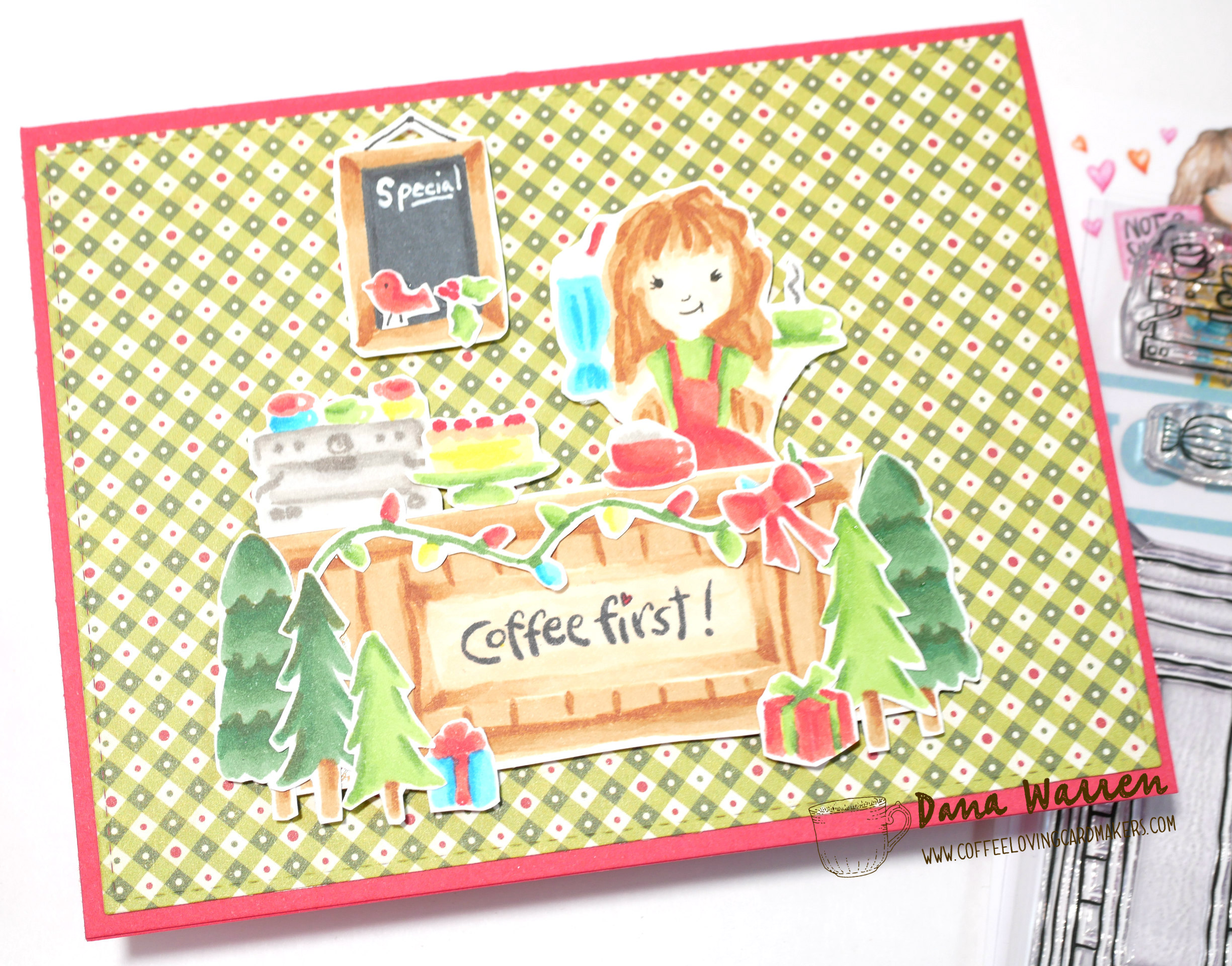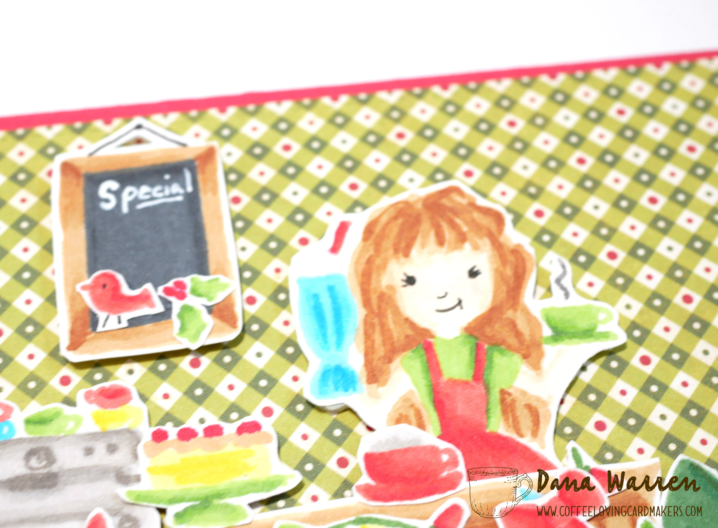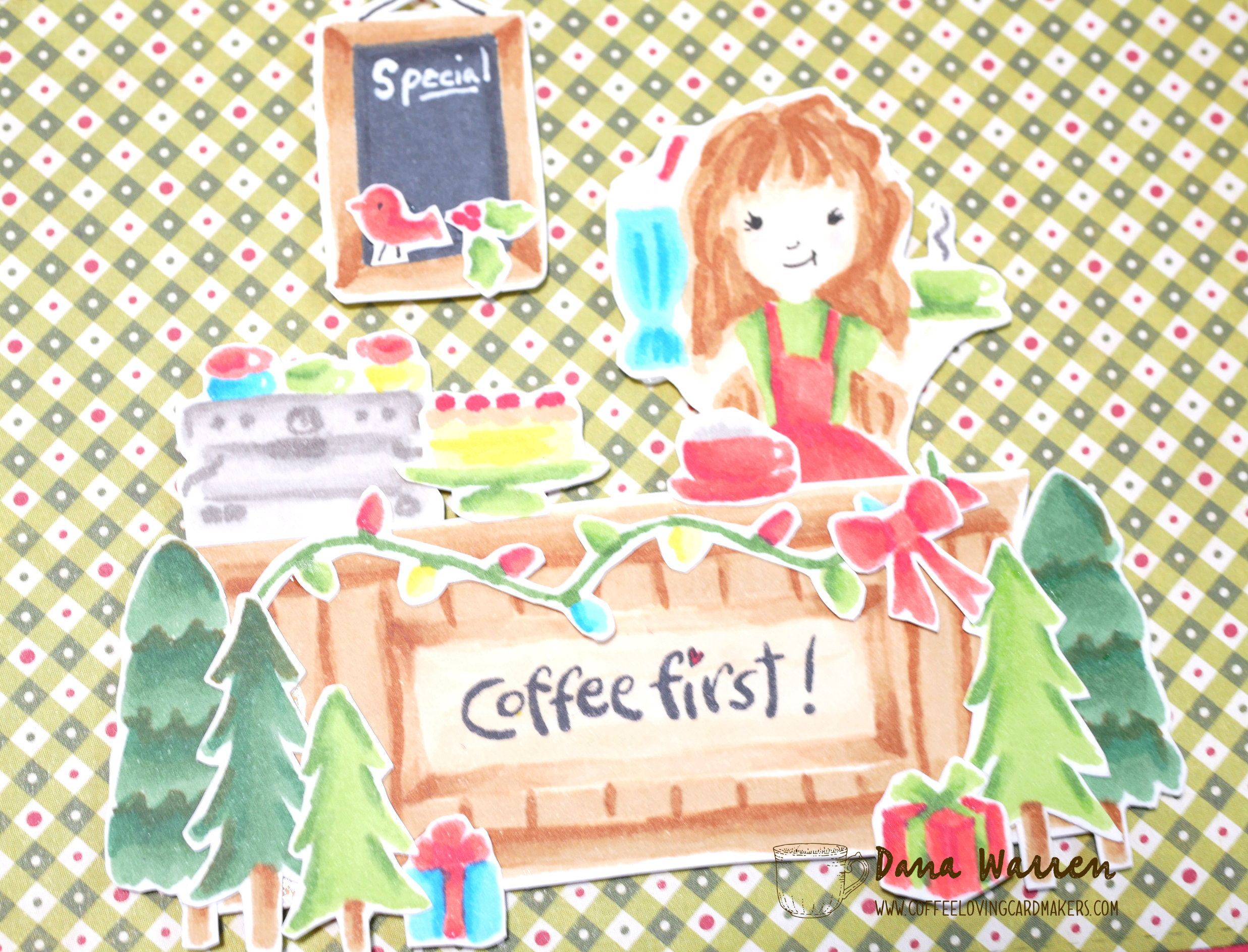 Once I was happy with everything I started adding everything to the card with foam tape. I made sure to have my Christmas light banner across the counter. I can see using this coffee shop with each holiday and season!!