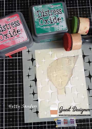 The card started with the girl stamp from the set She Is Fierce. I stamped one time on the card and one time on a post-it note (this last one I cut out to cover the image on the card). I covered the card with the Starry Night stencil and used green and red ink at random on the stencil.