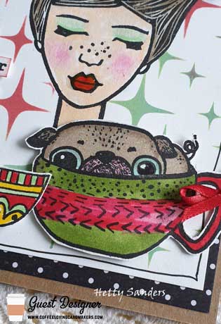 After coloring the girl with zig markers, I got out my Pugs and Hugs set (my prize!) and stamped thgis cute dog in the cup. I colored him, cut it out and tied a ribbon around the handle of the cup. With foam tape I added the pug to the card.